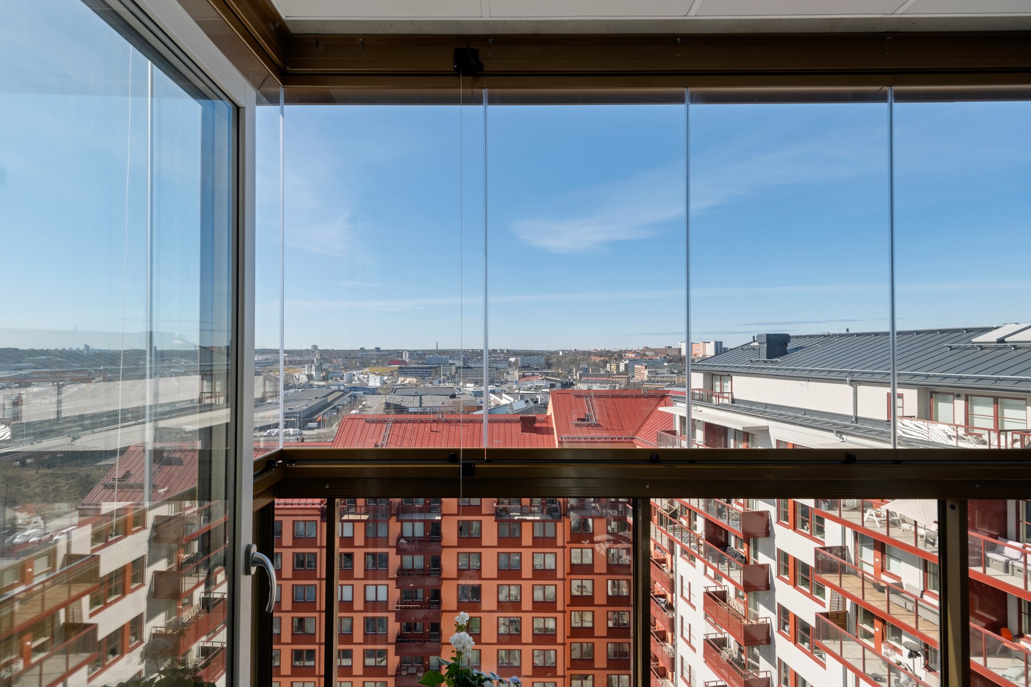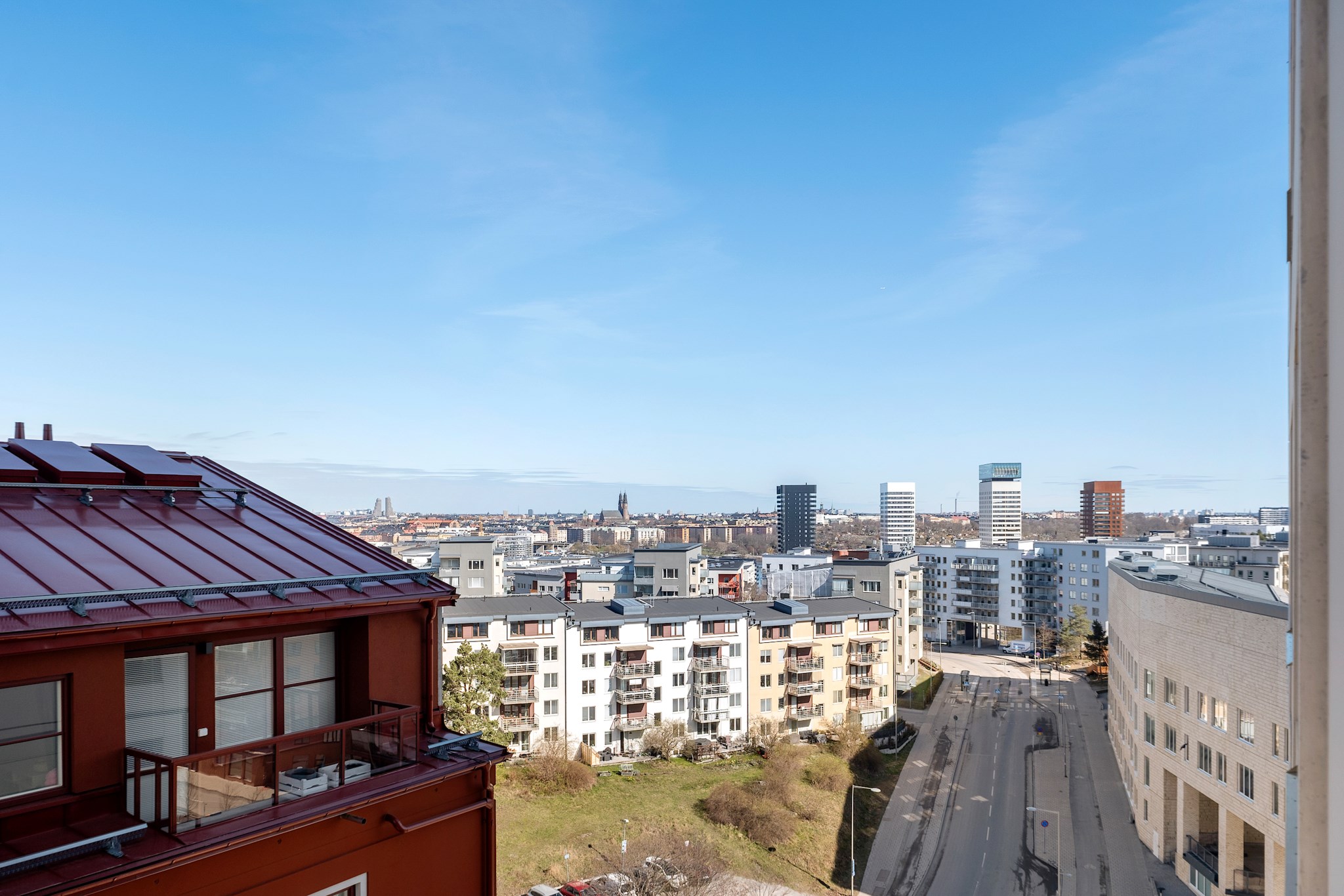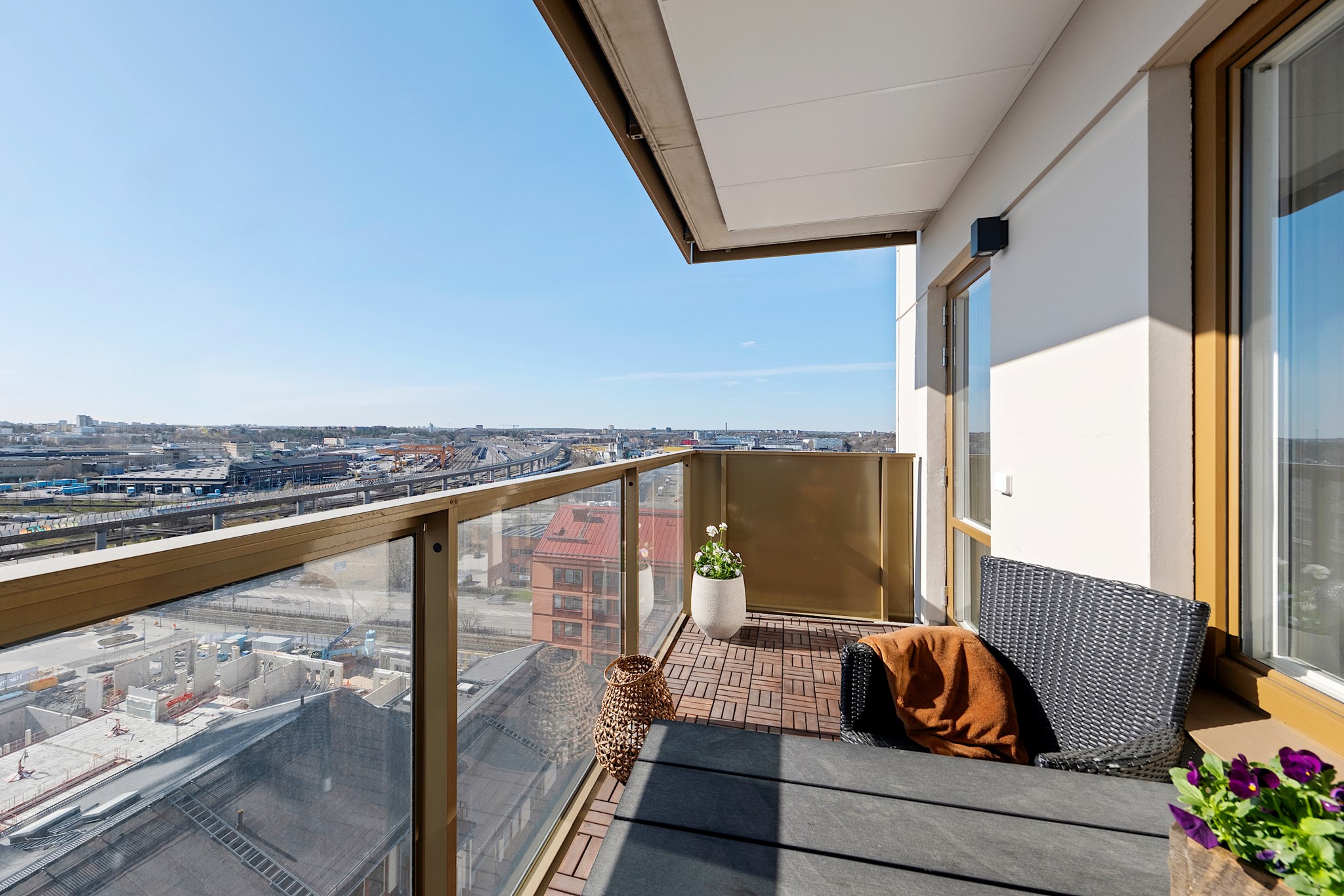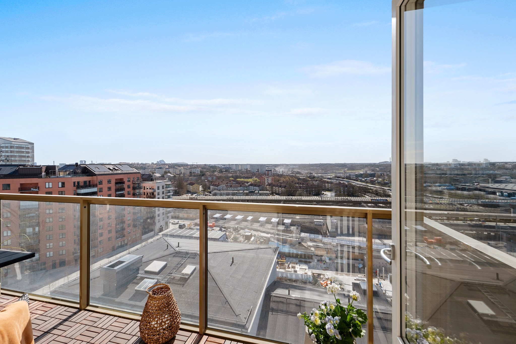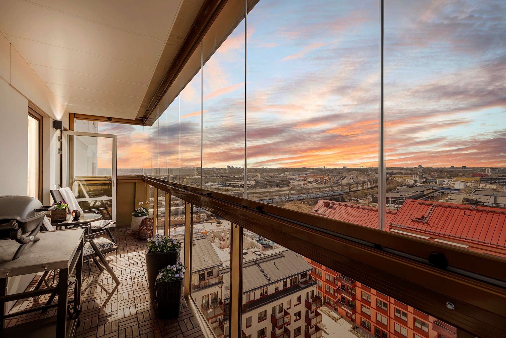 Välkommen till ett exklusivt boende på elfte våningen med ett oslagbart gavelläge, totalt insynsskyddat och med en panoramavy som sträcker sig över Stockholms vackra silhuett. Här bor du med ljus och rymd i fokus, tack vare fönster i tre väderstreck samt två generösa balkonger (varav den största som är inglasad) som bjuder på sol från tidig morgon till sen kväll – perfekta för både morgonkaffet och sommarkvällens middagar med utsikt.