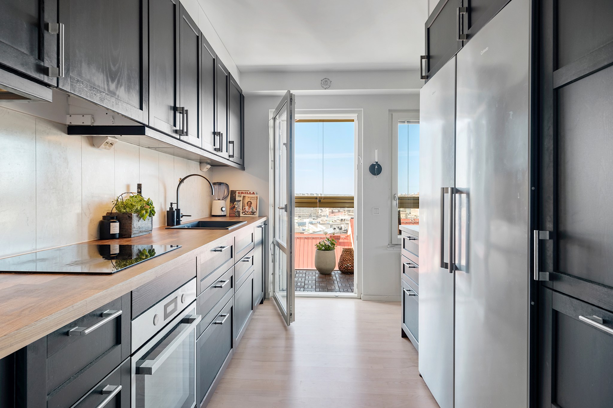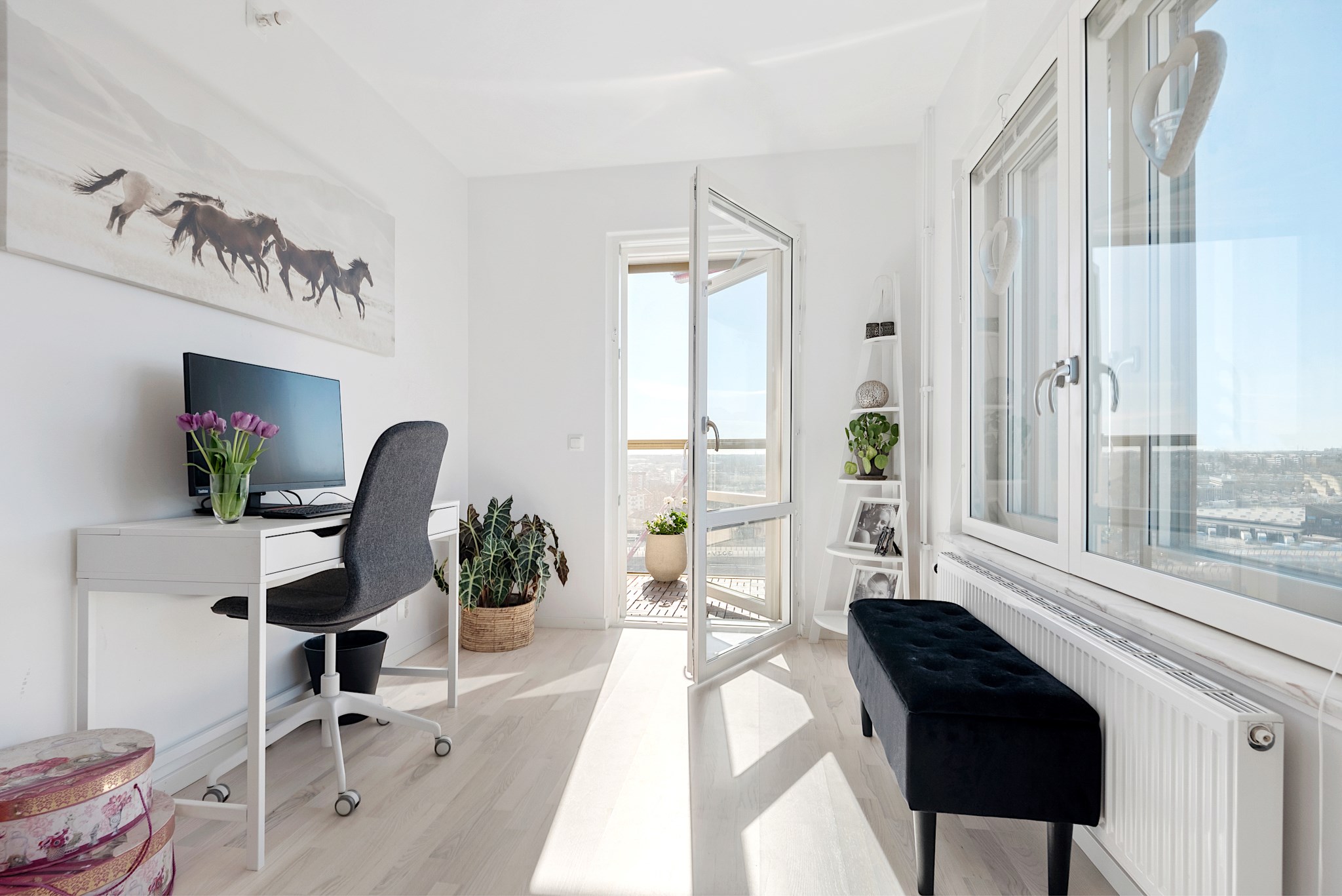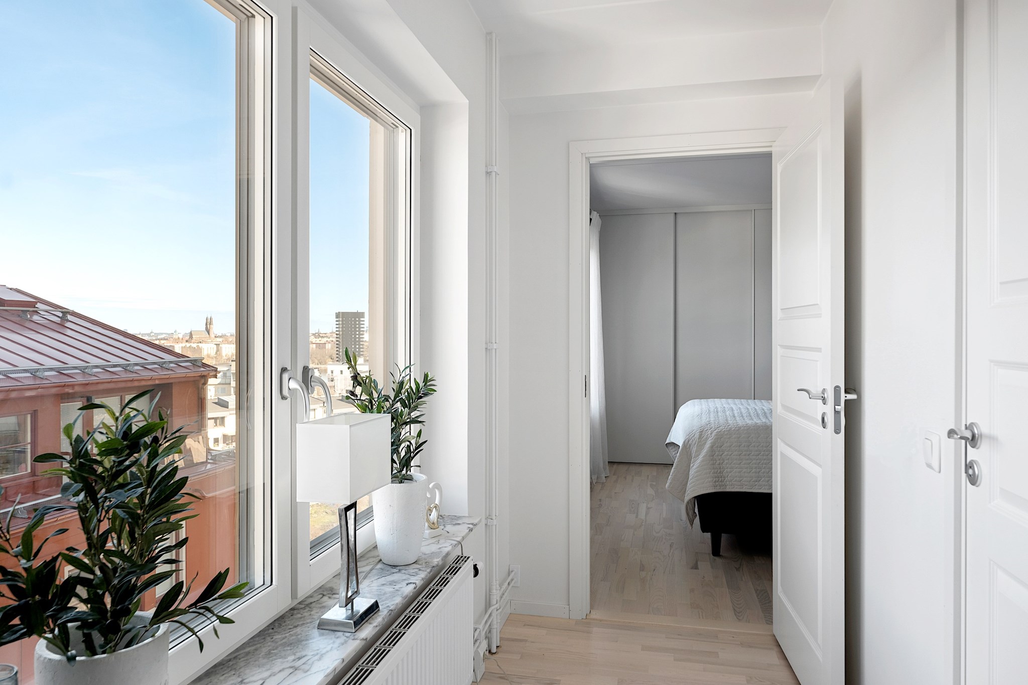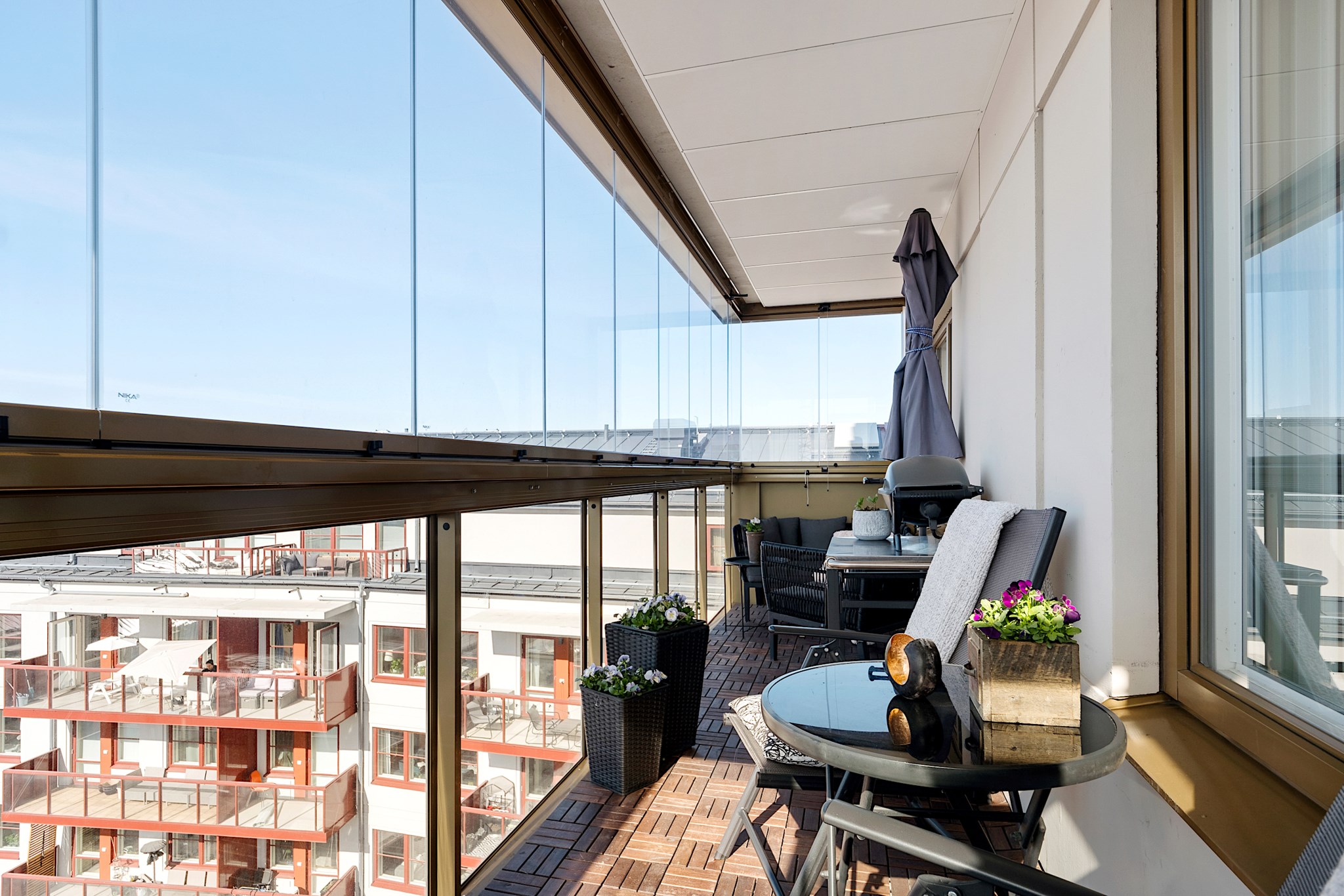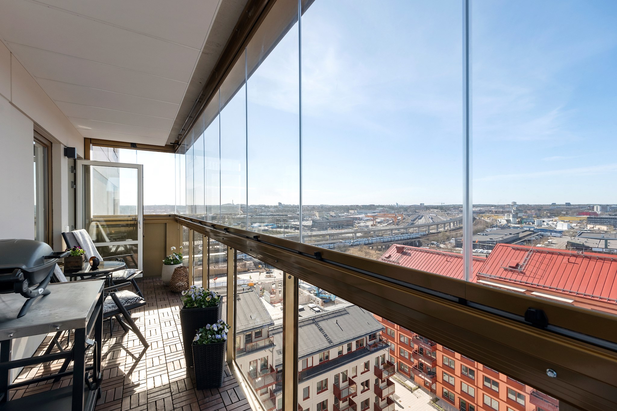 Välkommen till ett exklusivt boende på elfte våningen med ett oslagbart gavelläge, totalt insynsskyddat och med en panoramavy som sträcker sig över Stockholms vackra silhuett. Här bor du med ljus och rymd i fokus, tack vare fönster i tre väderstreck samt två generösa balkonger (varav den största som är inglasad) som bjuder på sol från tidig morgon till sen kväll – perfekta för både morgonkaffet och sommarkvällens middagar med utsikt.