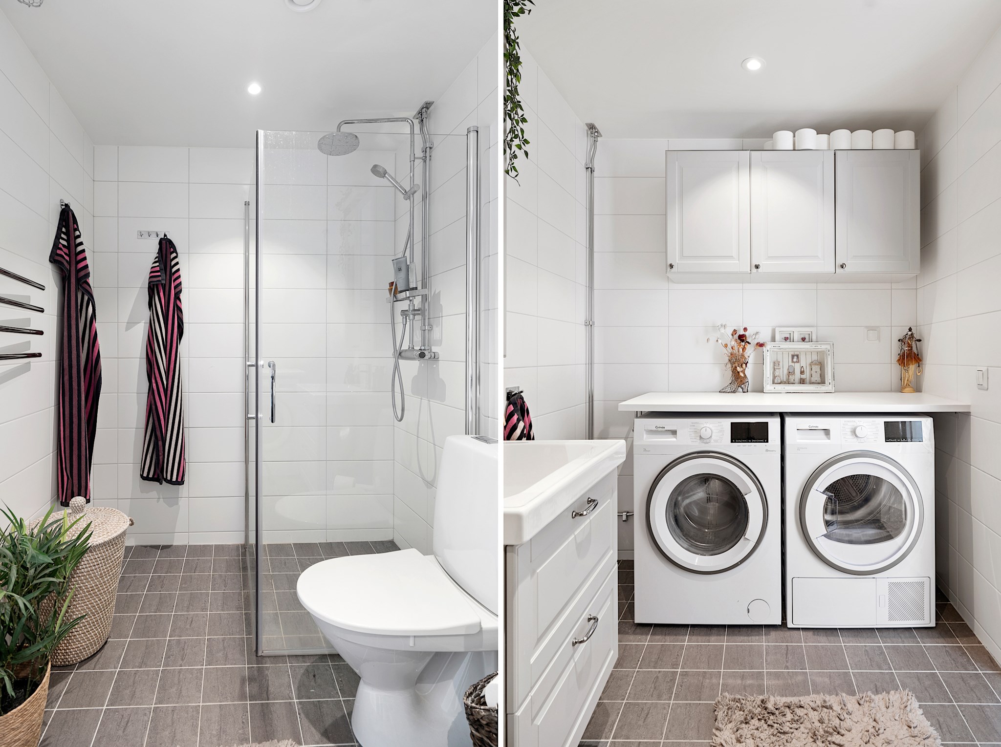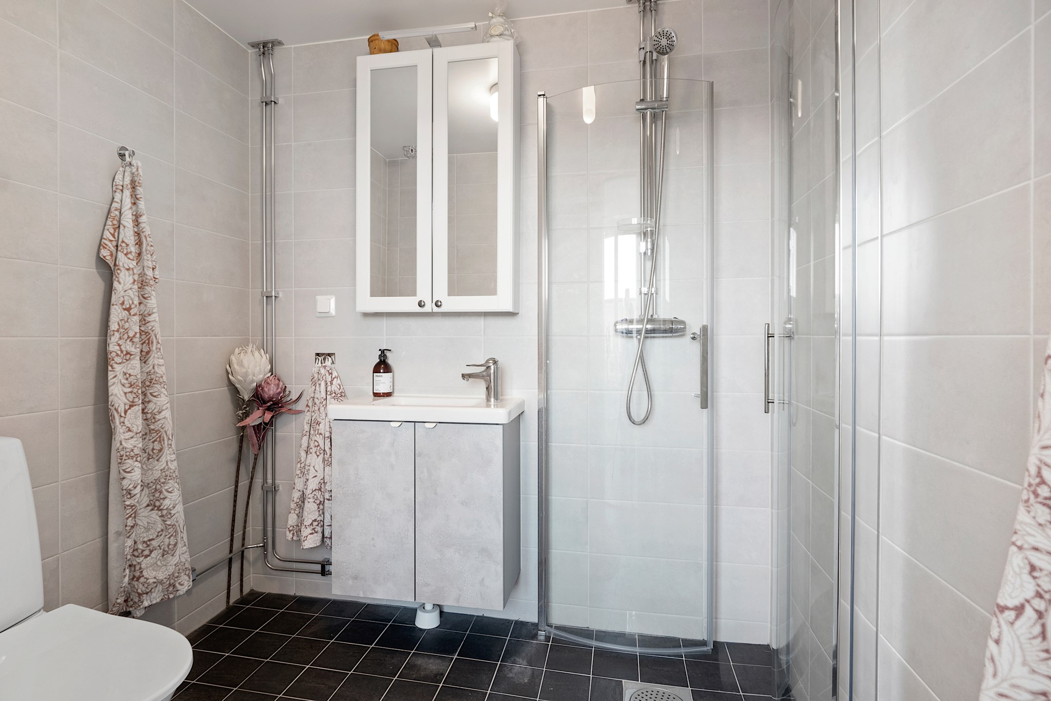 Bostaden har två badrum, båda helkaklade i stilrena materialval. Det större badrummet invid hallen är utrustat med dusch, wc, tvättmaskin, torktumlare, skåp och arbetsbänk, en praktisk tvättdel som underlättar vardagen. Den välkomnande hallen erbjuder gott om förvaring i skjutdörrsgarderob samt plats för avhängning.