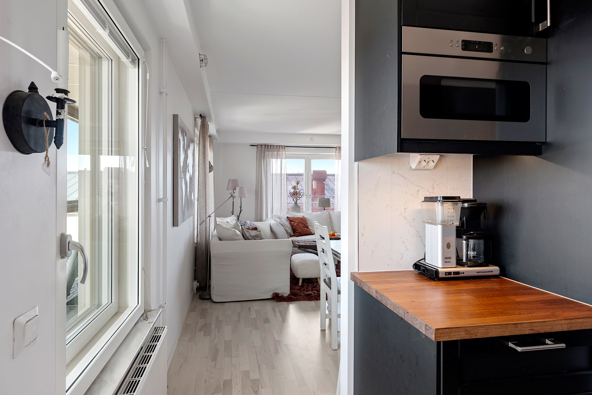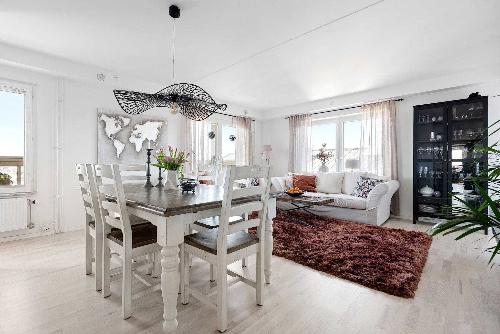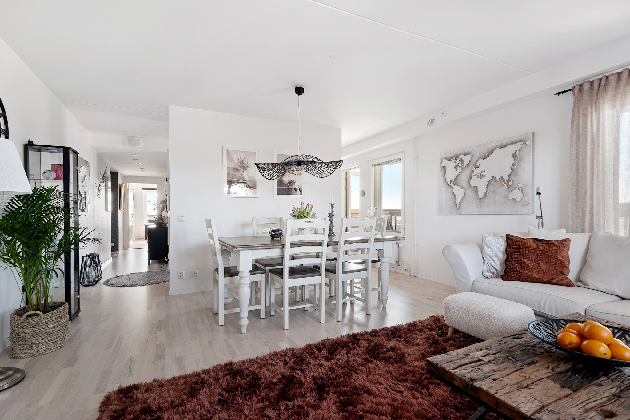 Lägenheten erbjuder en smart och mycket funktionell planlösning. Det rymliga vardagsrummet badar i ljus tack vare stora fönsterpartier och har direkt access till den största balkongen. Här finns gott om plats för både stor soffgrupp, fåtölj, mediamöbler och en matplats för sociala middagar.