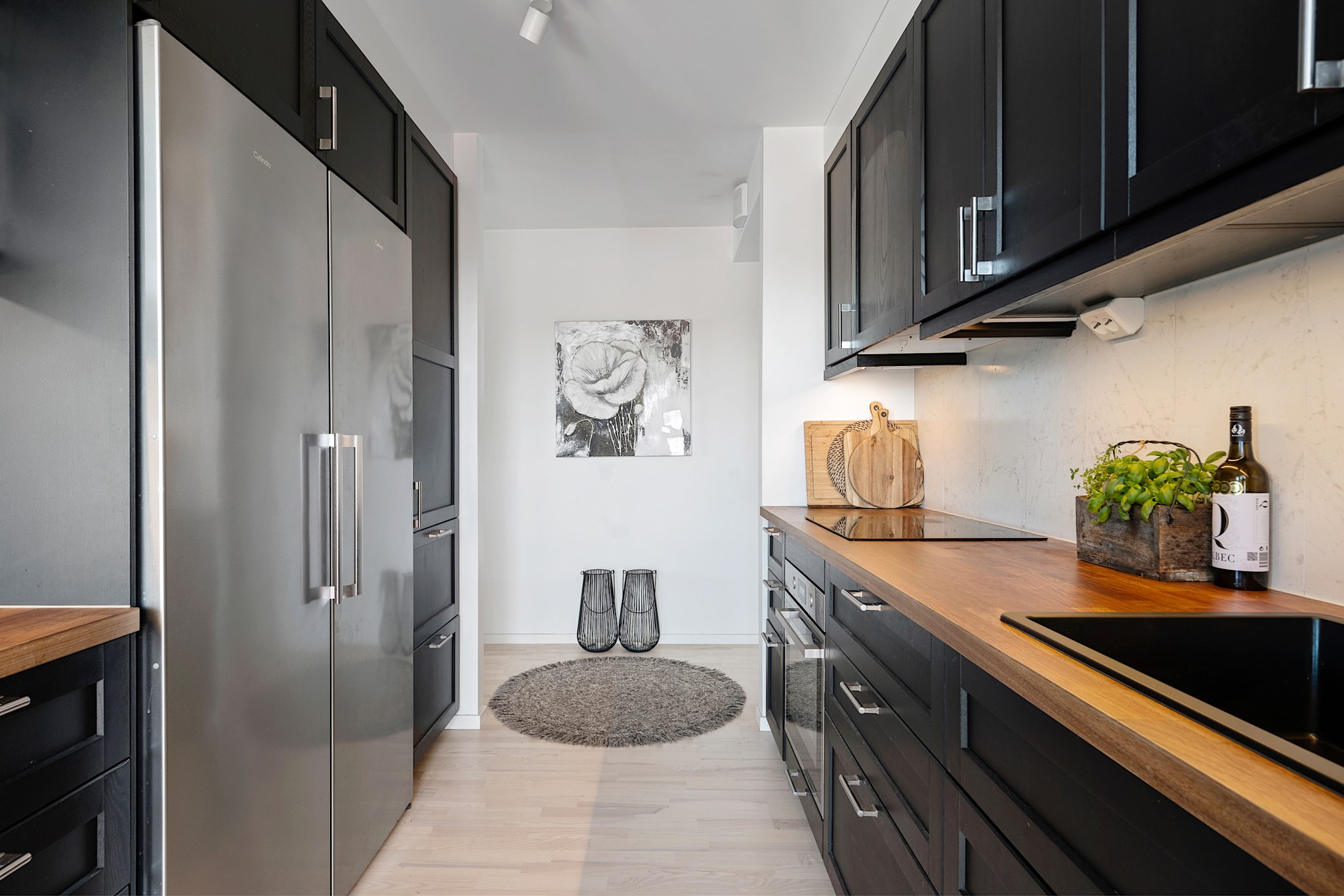 Köket är smakfullt och påkostat med en komplett maskinpark, arbetsvänlig bänkskiva i trä samt generösa arbetsytor och förvaringsmöjligheter – en perfekt plats för såväl vardagsmatlagning som festmåltider.