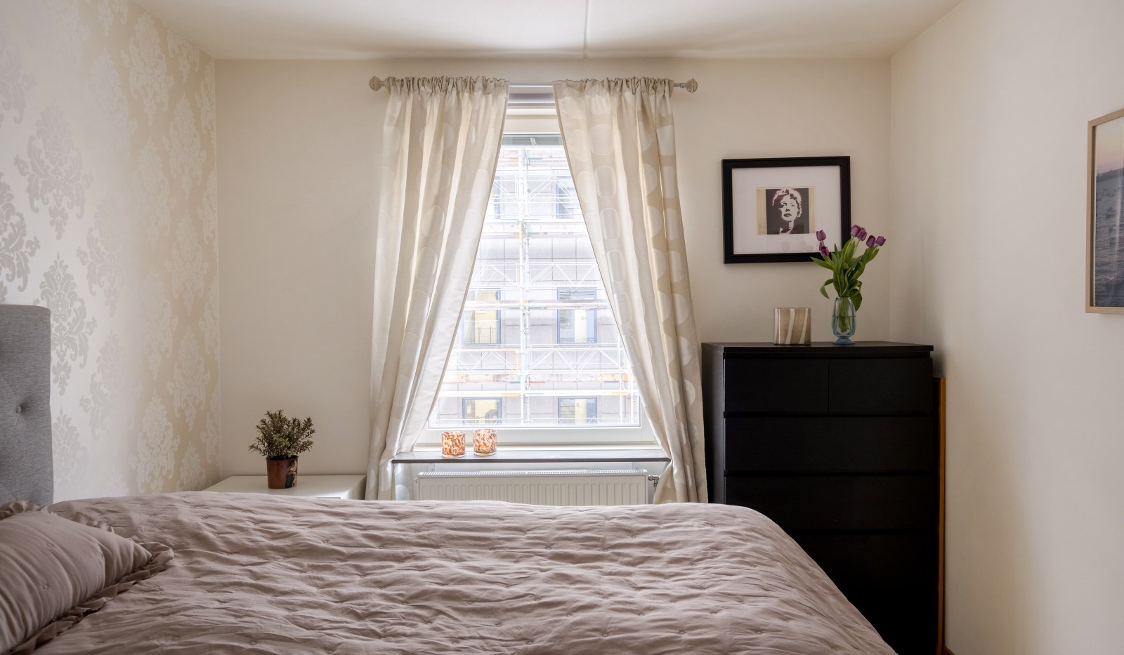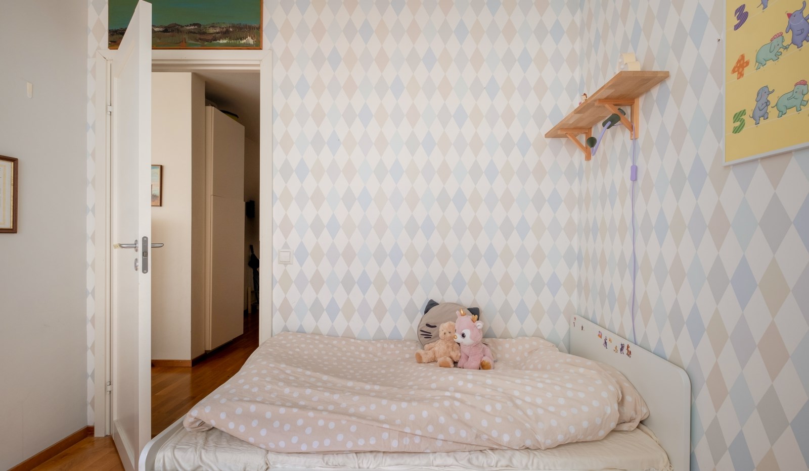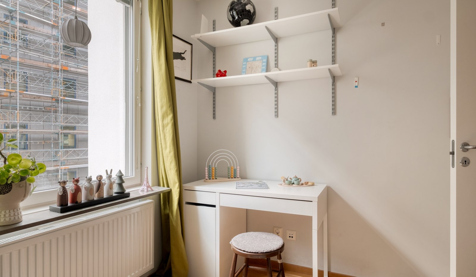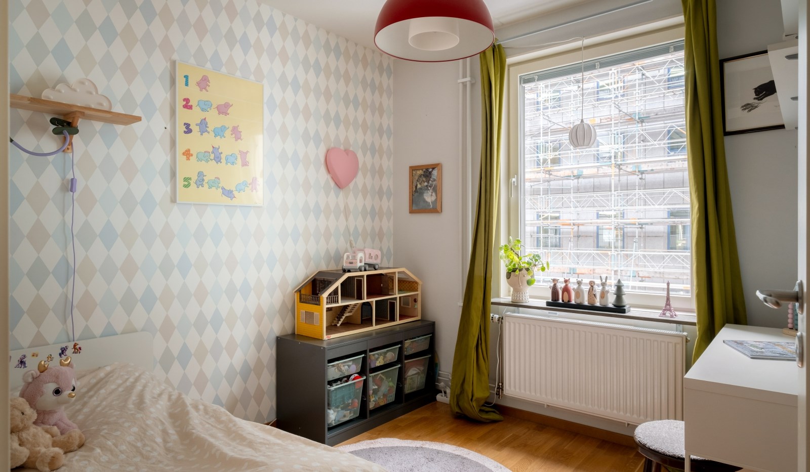 Det andra sovrummet är både charmigt och flexibelt – perfekt som barnrum, gästrum eller hemmakontor. Rummet har fint ljusinsläpp, stilfull tapet och samma vackra ekparkett som i övriga rum.