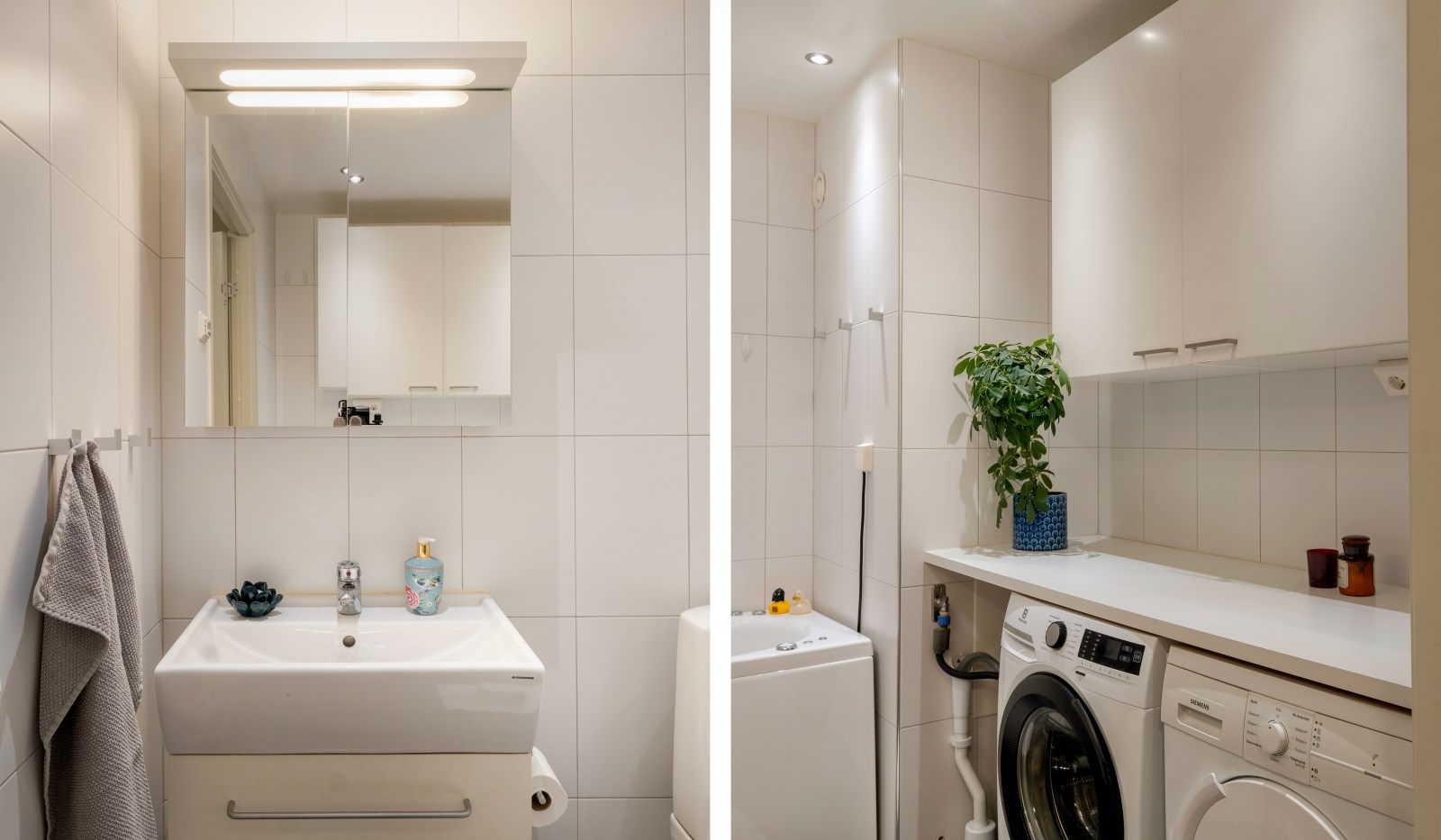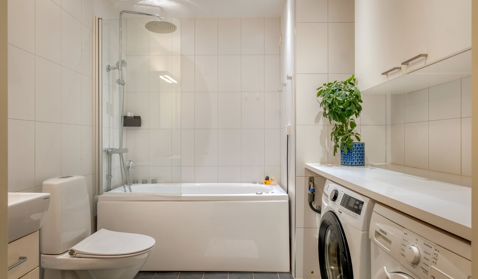 Stort och fräscht badrum i stilren design med vitt kakel och grått klinker med behaglig golvvärme. Här finns dusch, wc, handfat med kommod samt tvättdel med tvättmaskin, torktumlare och praktisk arbetsbänk med förvaring ovanför – allt du behöver i vardagen.