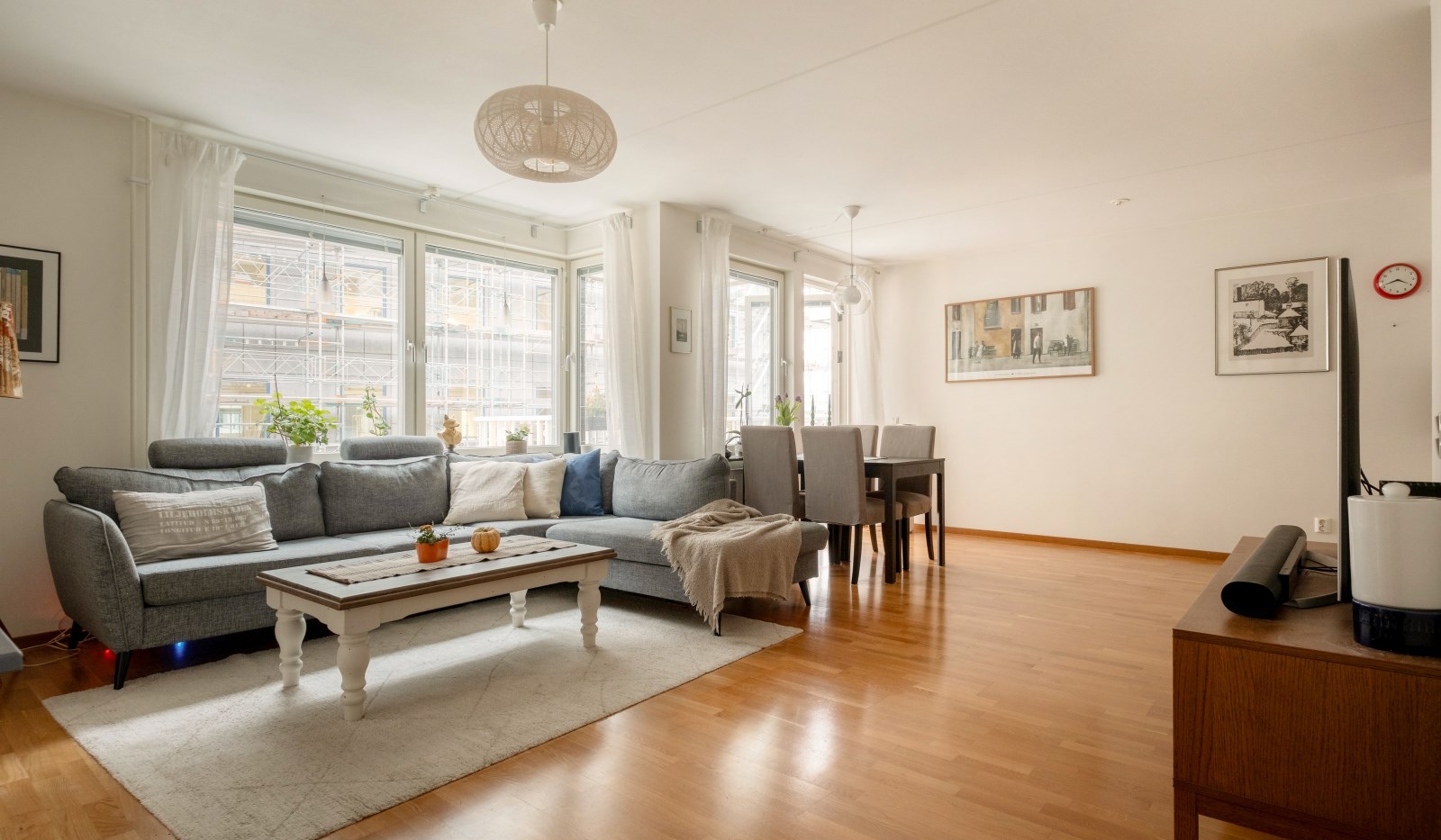 Ljust, luftigt och inbjudande – vardagsrummet blir hemmets naturliga samlingspunkt. Det stora fönsterpartiet släpper in generöst med dagsljus och den öppna planlösningen mot köket gör det enkelt att umgås. Här finns gott om plats för både soffgrupp och ett stort middagsbord – perfekt för middagar och sociala kvällar. Väggarna är målade i vitt och golvet pryds av vacker ekparkett.