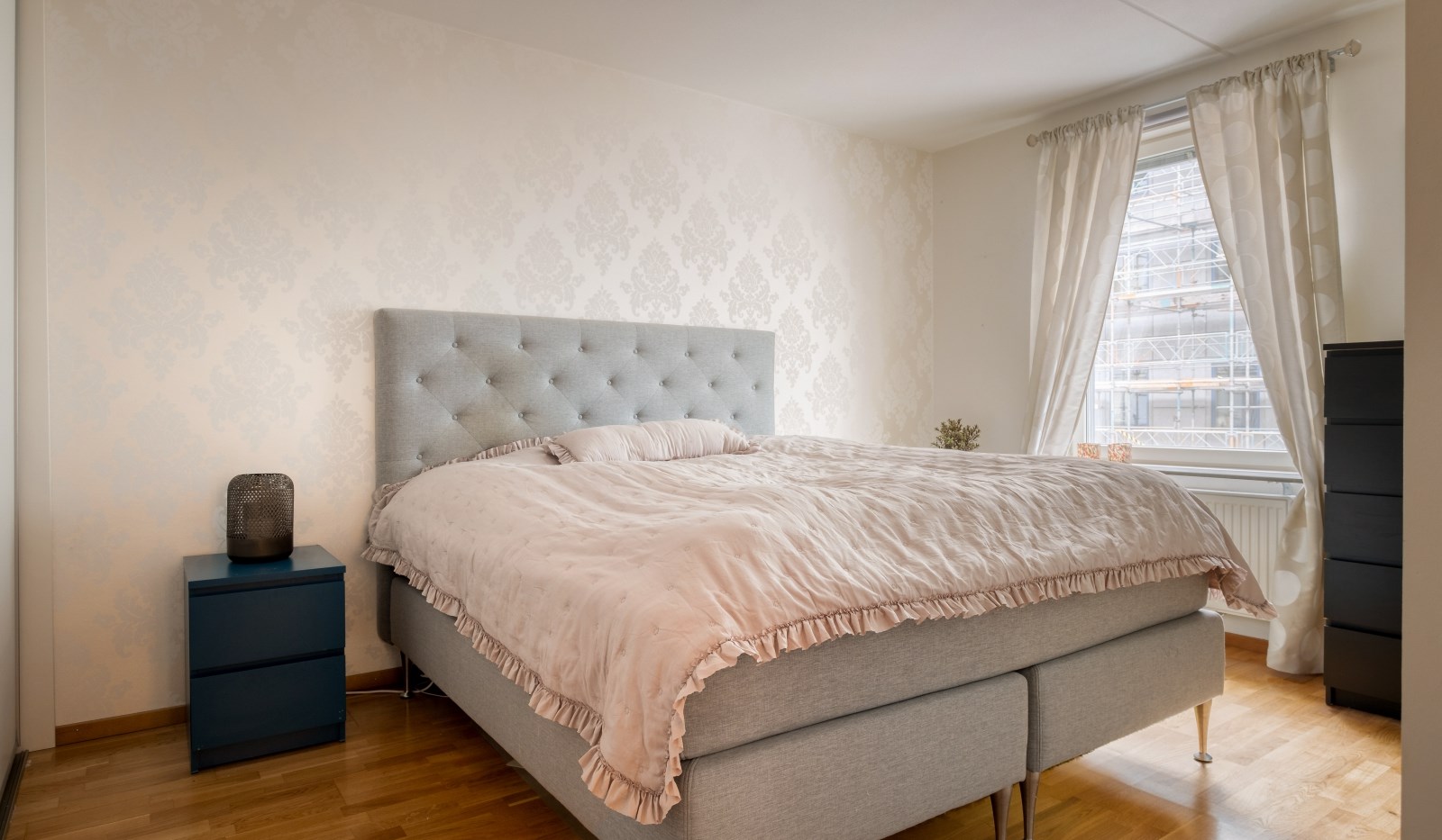 Stort och rofyllt master bedroom med plats för dubbelsäng och sängbord. En praktisk skjutdörrsgarderob ger gott om förvaring. Ljusa väggar och ekparkett skapar en harmonisk och lugn atmosfär – en plats för vila och återhämtning.