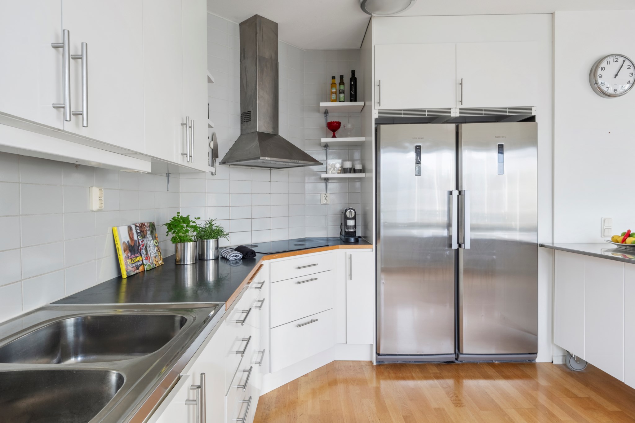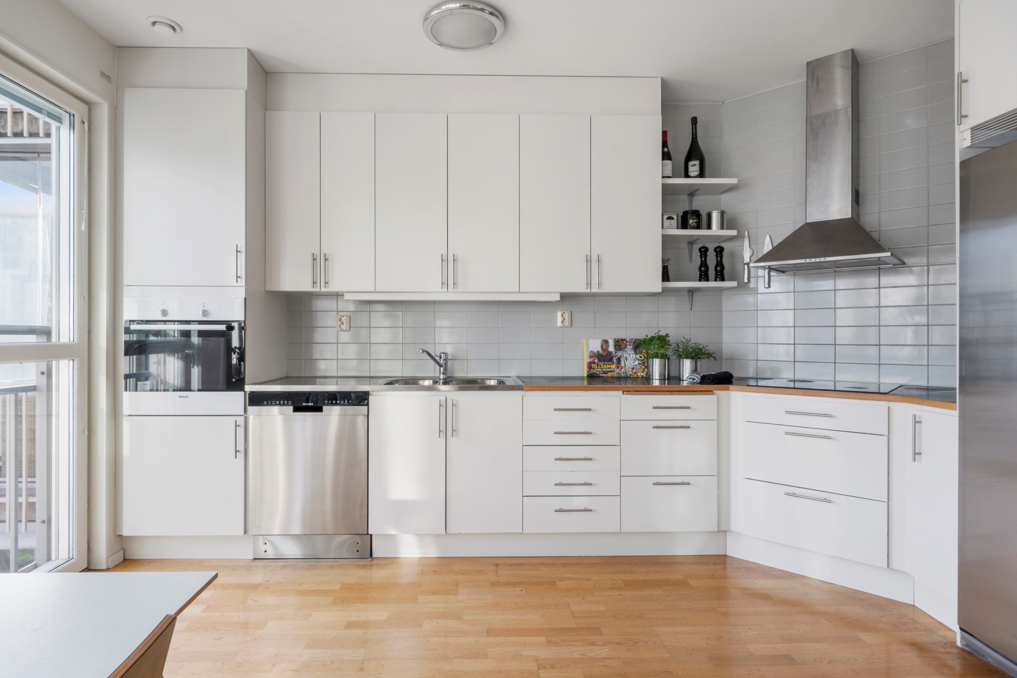 Det stilrena köket erbjuder generösa arbetsytor och bra förvaring. Vita skåpsluckor och snyggt kakel ramar in den fulla maskinella utrustningen med häll, rostfri fläkt, hel kyl och frys, diskmaskin, varmluftsugn och mikro.