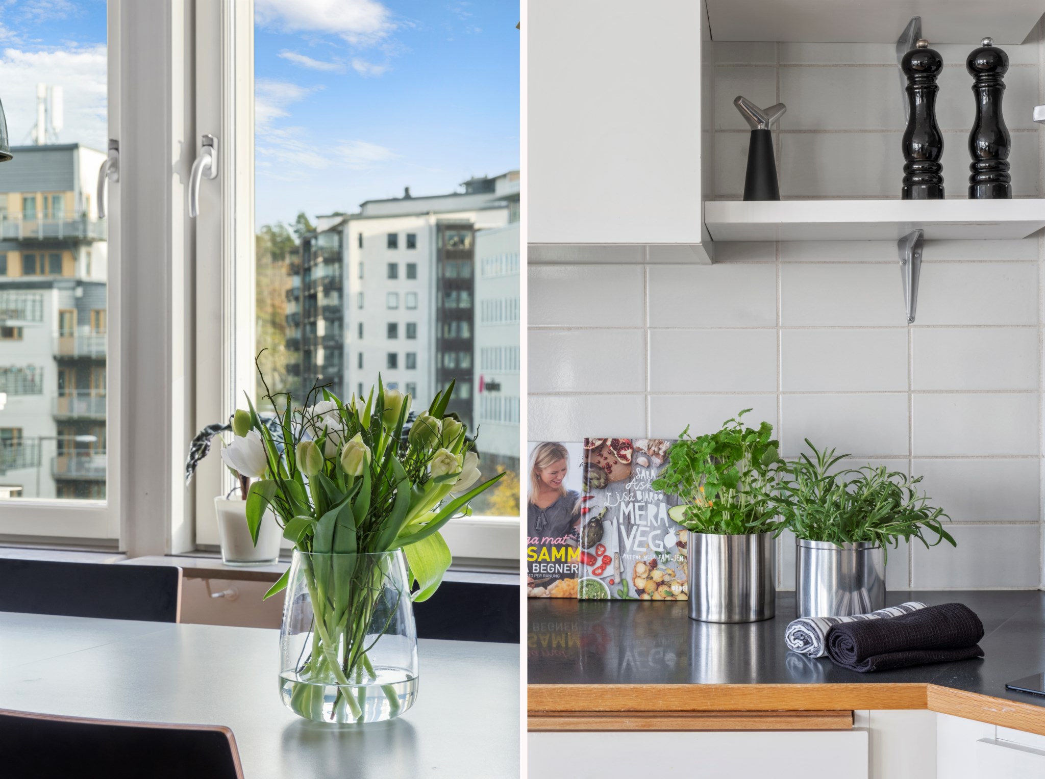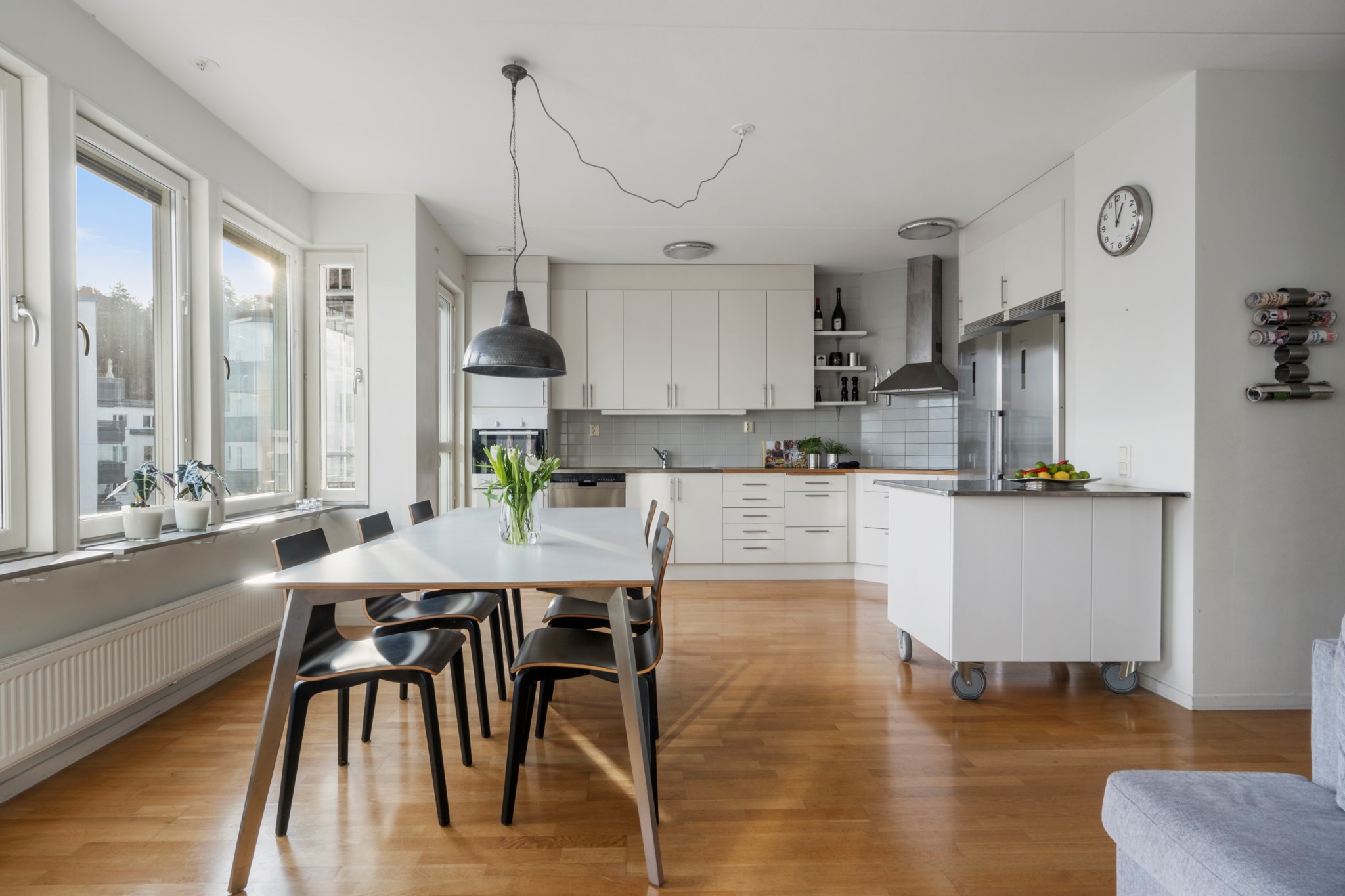 Den franska balkongen släpper in rikligt med ljus och matplatsen i burspråket skapar en varm och inbjudande atmosfär. Öppen planlösning mot vardagsrummet gör köket till hemmets naturliga samlingspunkt.