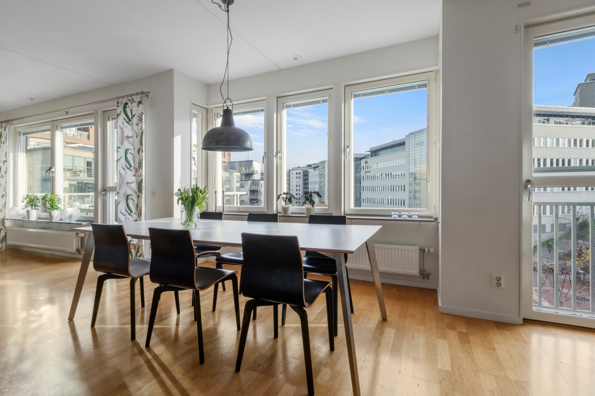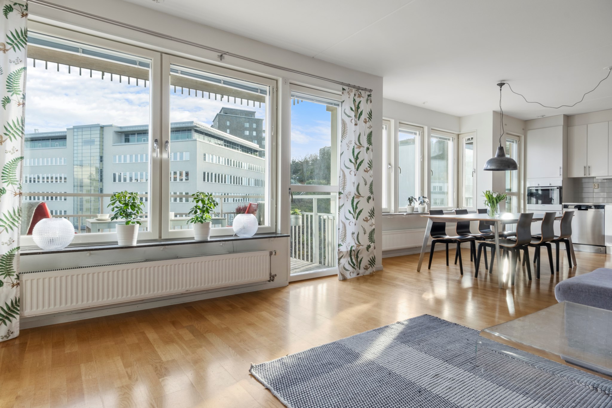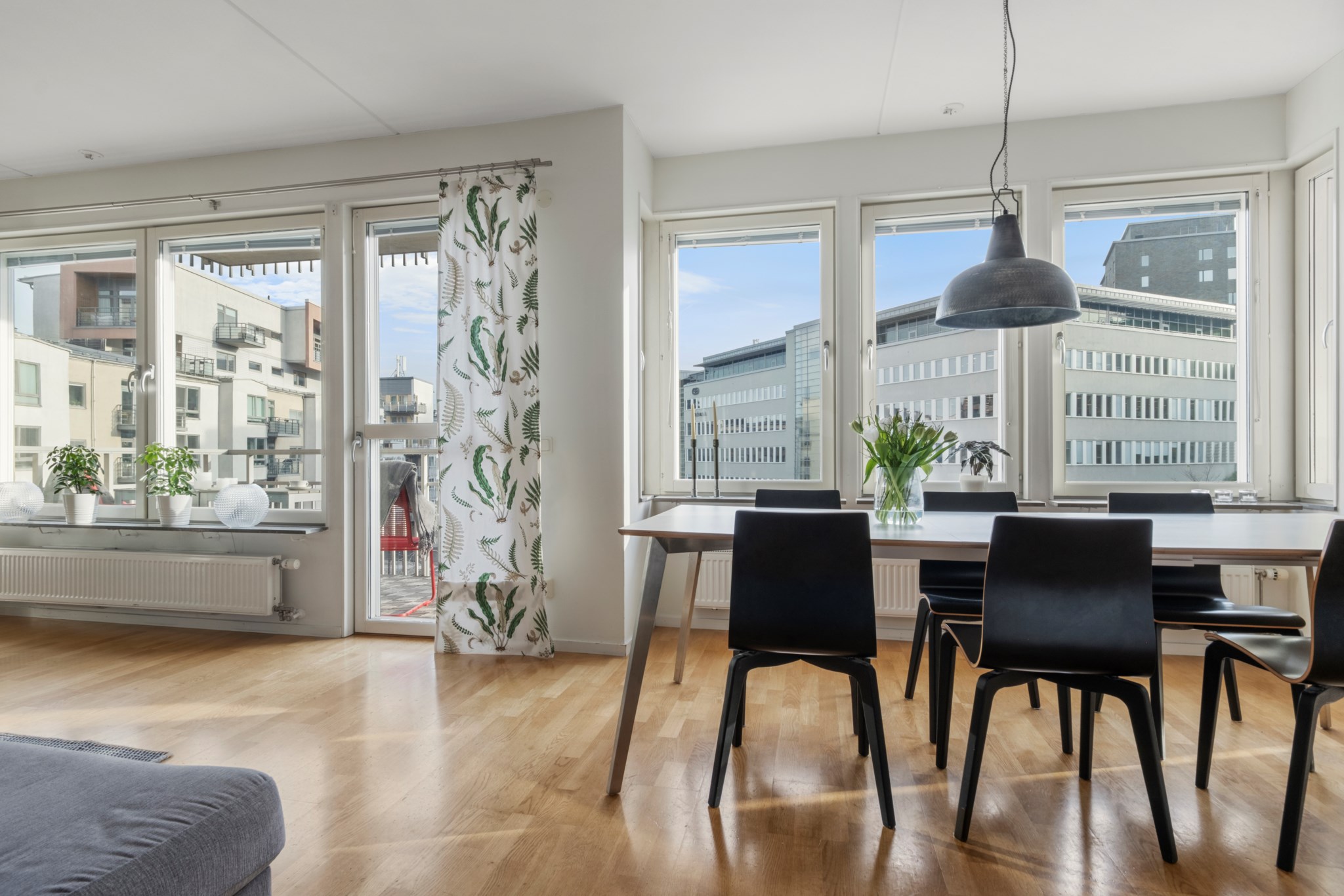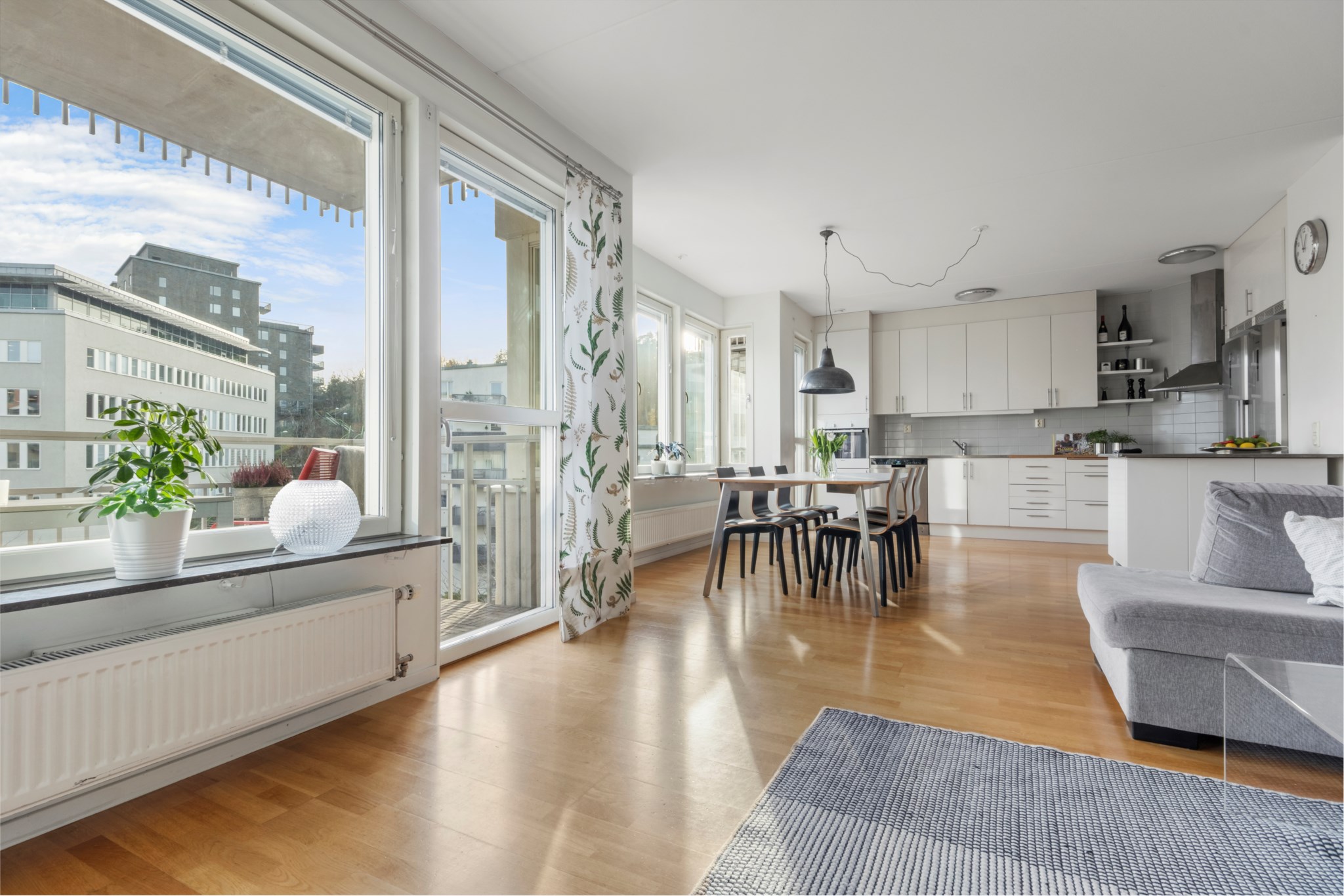 Varmt välkommen till denna eftertraktade trea i hjärtat av Liljeholmskajen, ett hem där utsikten, ljuset och rymden skapar en boendemiljö långt utöver det vanliga.