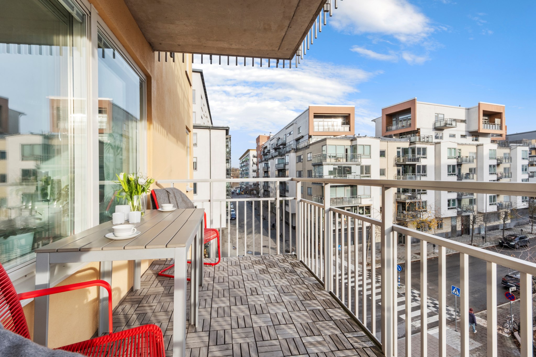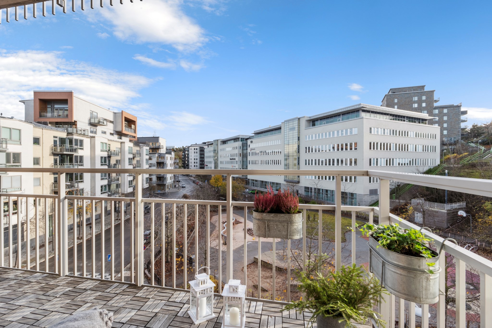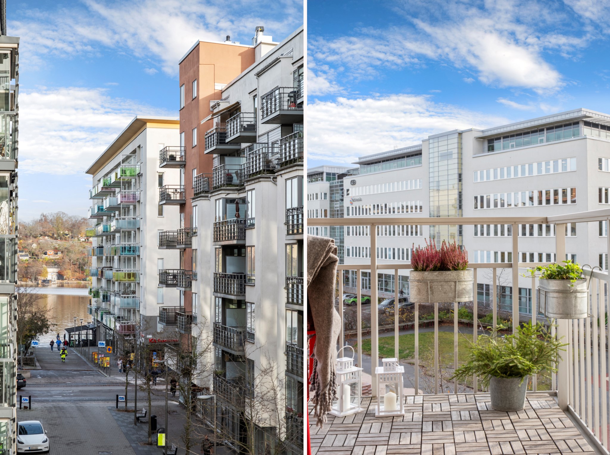 Den stora balkongen i sydostläge är en av bostadens absoluta höjdpunkter. Här har du gott om plats för utemöbler, växtlighet och trevlig belysning, och kan njuta av både parkmiljö och sjöglimt över Mälaren.