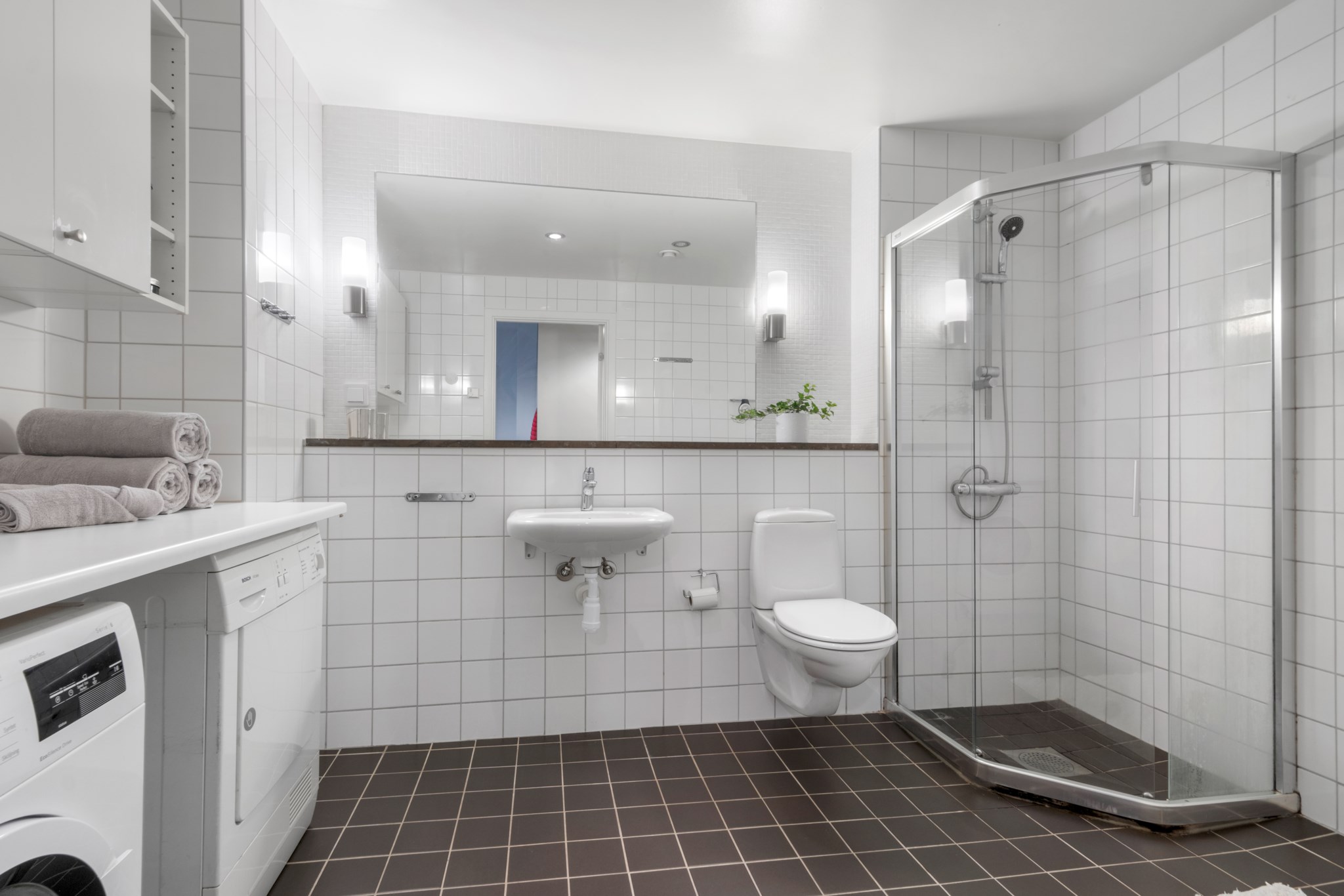 Stort och smakfullt helkaklat badrum med vita väggar, mosaikdetaljer och mörkt klinkergolv. Här finns tvättmaskin, torktumlare, tvättställ samt en praktisk arbetsbänk, en perfekt kombination av komfort och funktion.