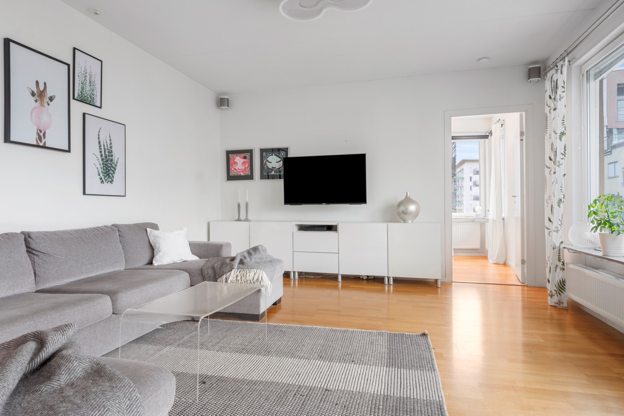 Ett stort och ljust vardagsrum med plats för både soffgrupp, TV-möbel, läshörna och sociala tillställningar. De stora fönsterpartierna och balkongdörren ger ett härligt ljusflöde.
