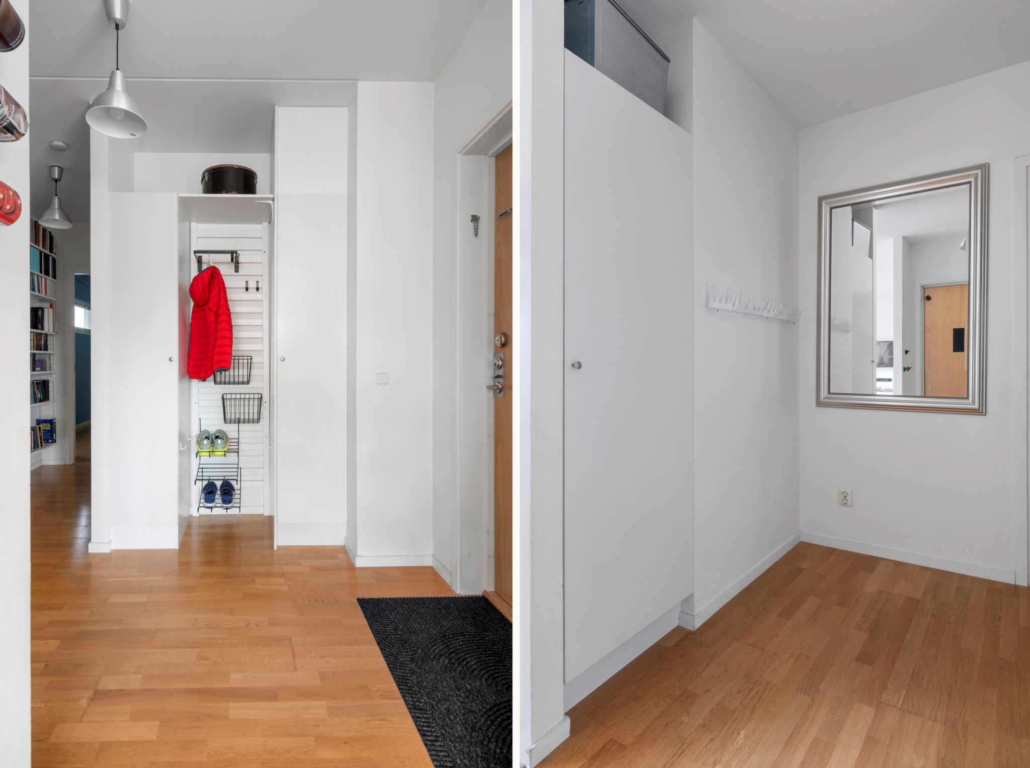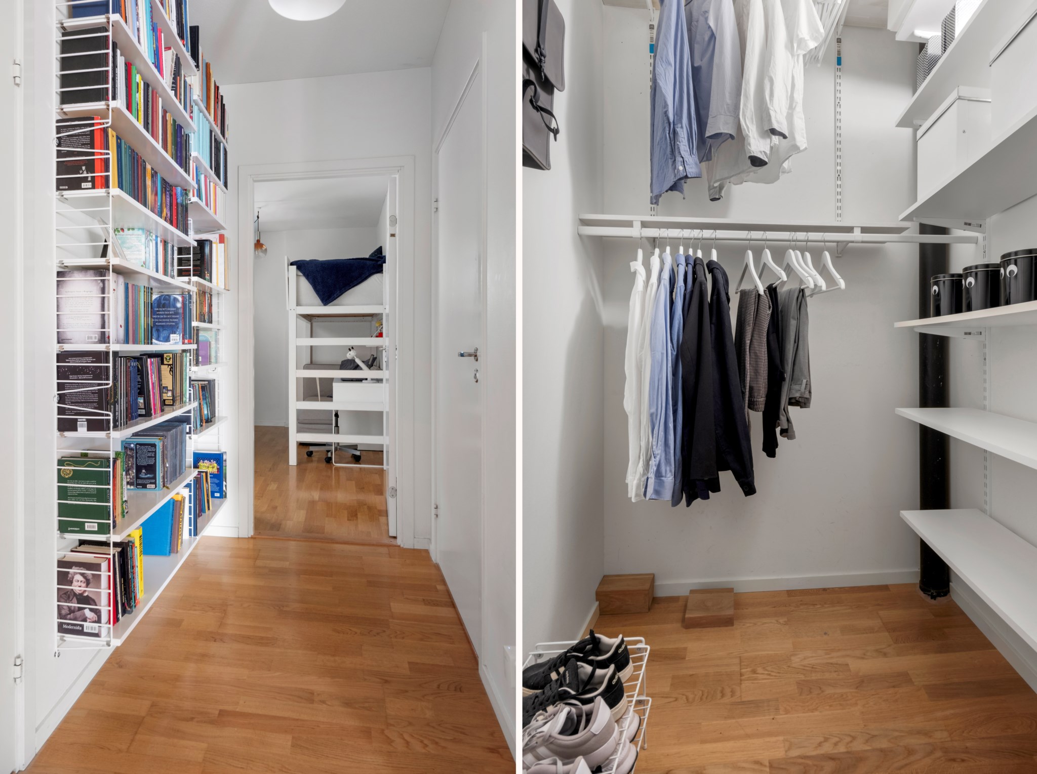 Du välkomnas av en ljus och luftig hall med gott om avhängningsmöjligheter. Längre in finns en stor klädkammare, perfekt för att hålla ordning i vardagen.