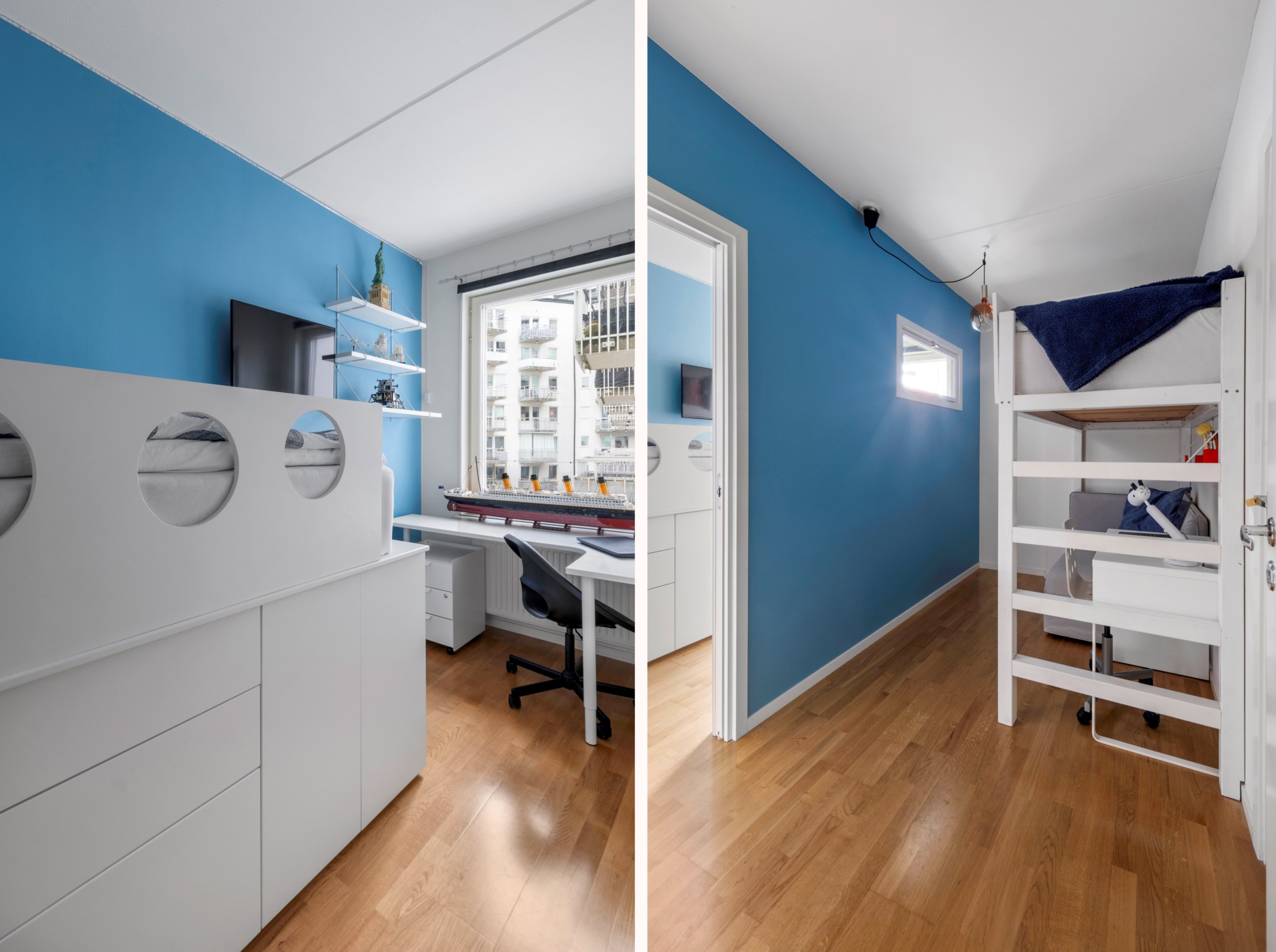 Det andra sovrummet är idag uppdelat i två mindre sovutrymmen, en praktisk lösning som ger extra sovplatser, möjlighet till barn som vill ha egna hörn eller ett kombinerat arbetsrum och gästsovplats.