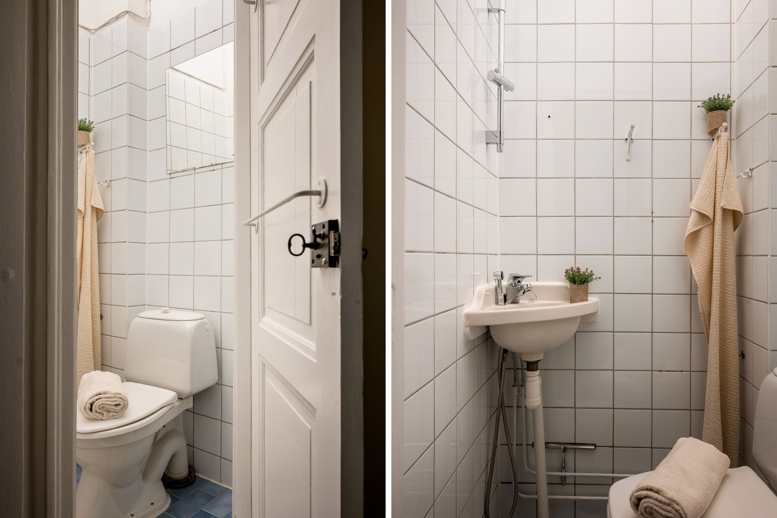 Här får du helkaklade väggar i vit färg och en grå ton på klinkergolvet. WC och stockholmsdusch.