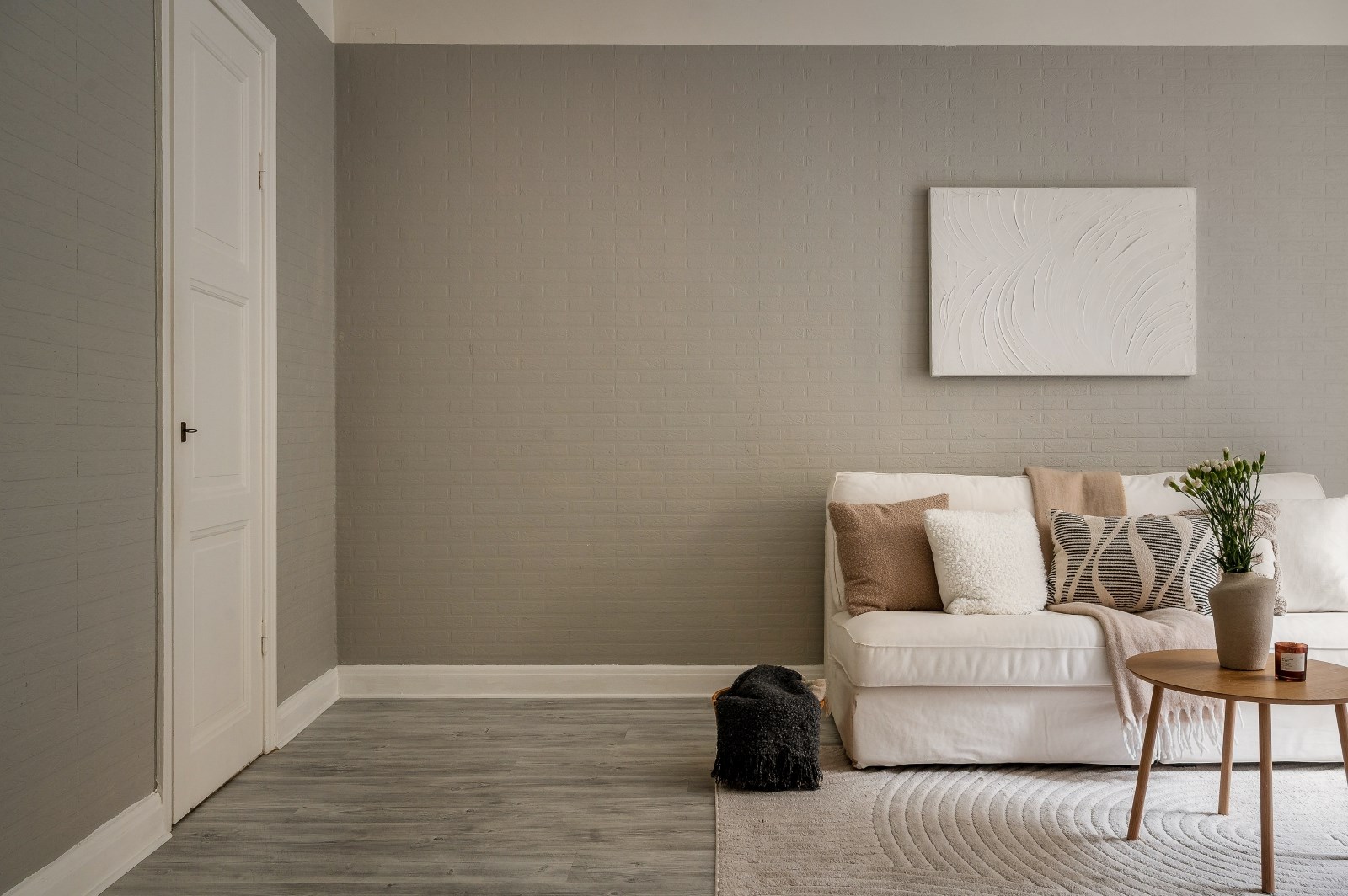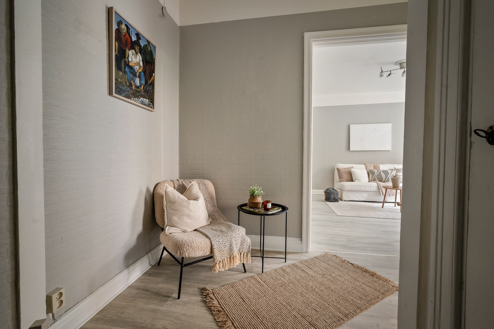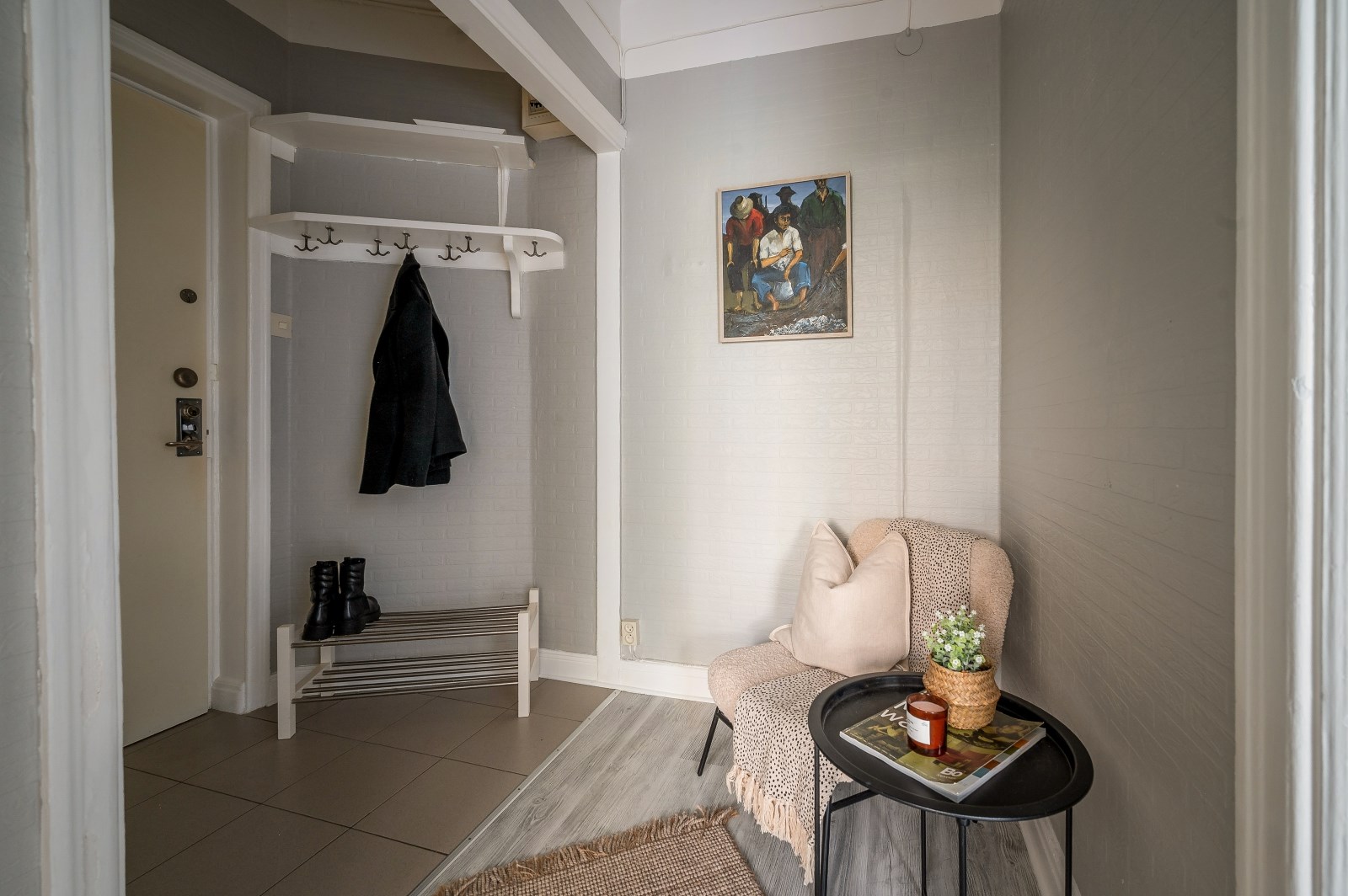 Välkomnande och ljus hall med vitmålade väggar och slitstarkt kalkat golv. Här finns avhängningsmöjligheter via hatthylla till vänster samt WC direkt till höger.