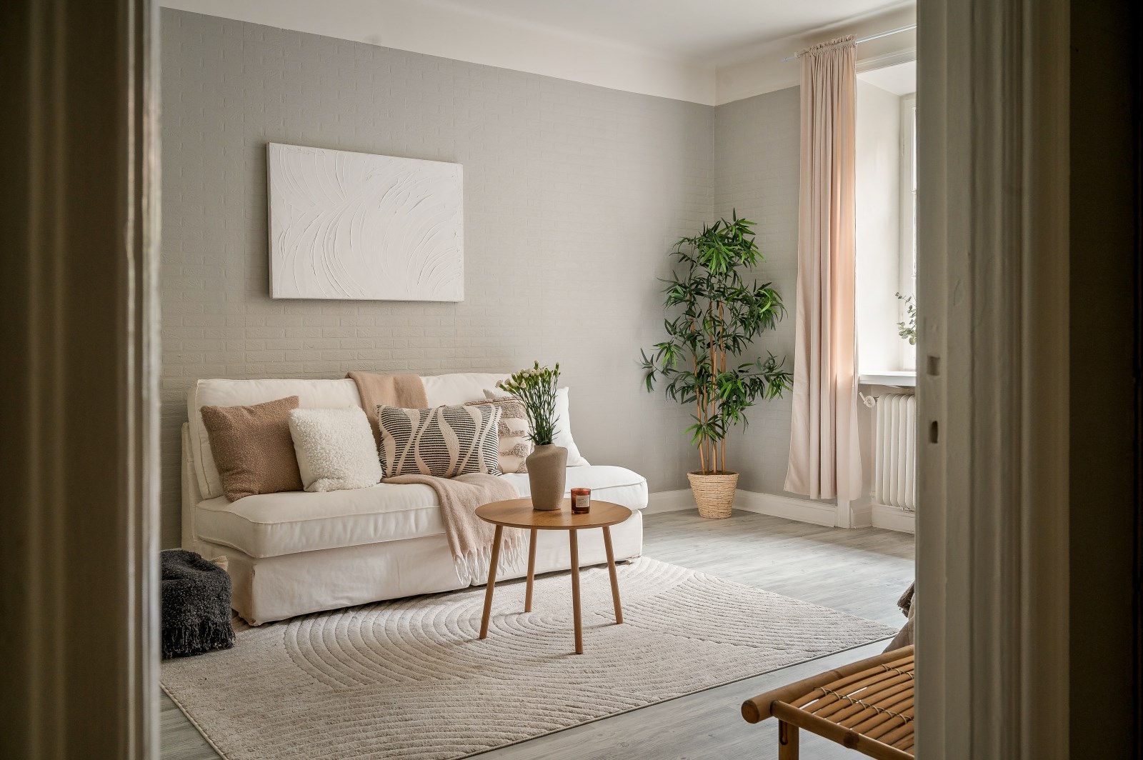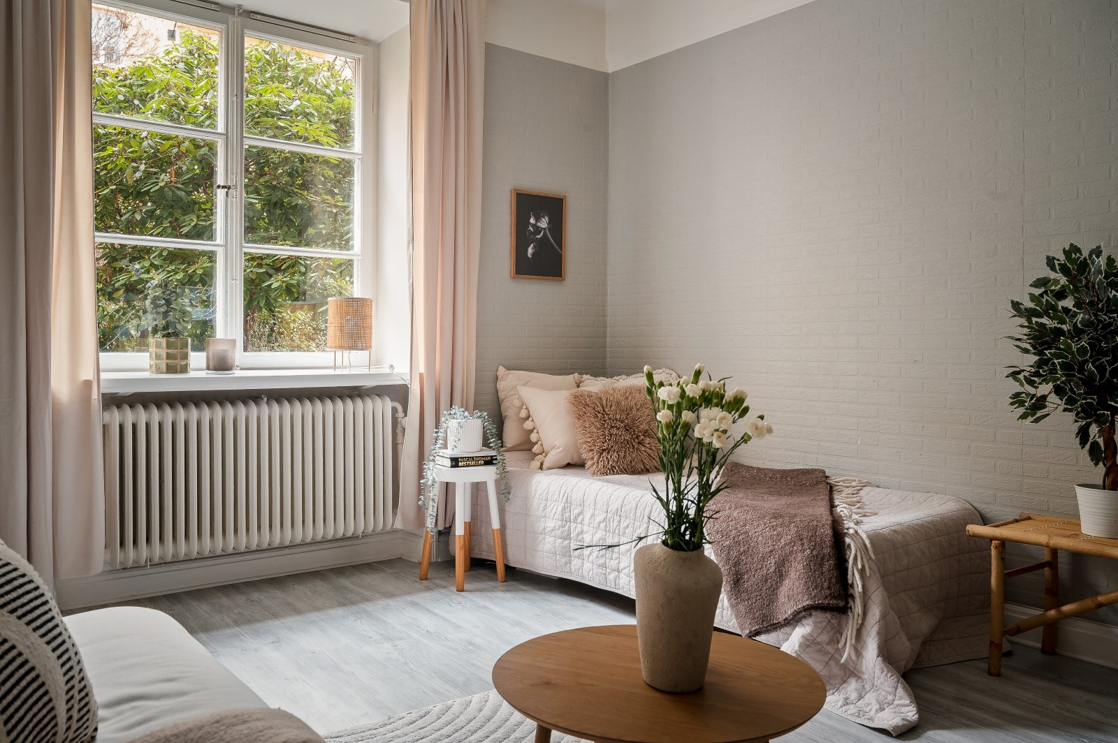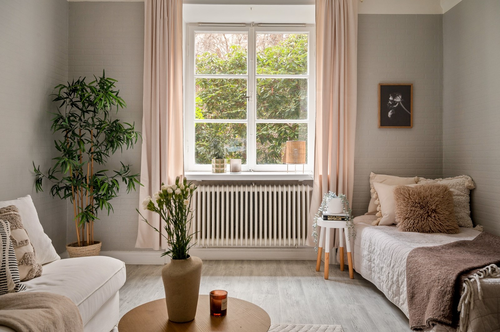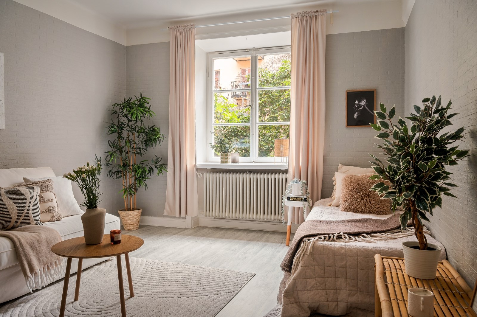Ett luftigt och harmoniskt rum i ljusa toner. Ett stort spröjsat fönster släpper in rikligt med ljus från den grönskande innergården. Här finns gott om plats för både soffgrupp, säng samt förvaring. I ena hörnet finns ett praktiskt inbyggt garderobsutrymme.