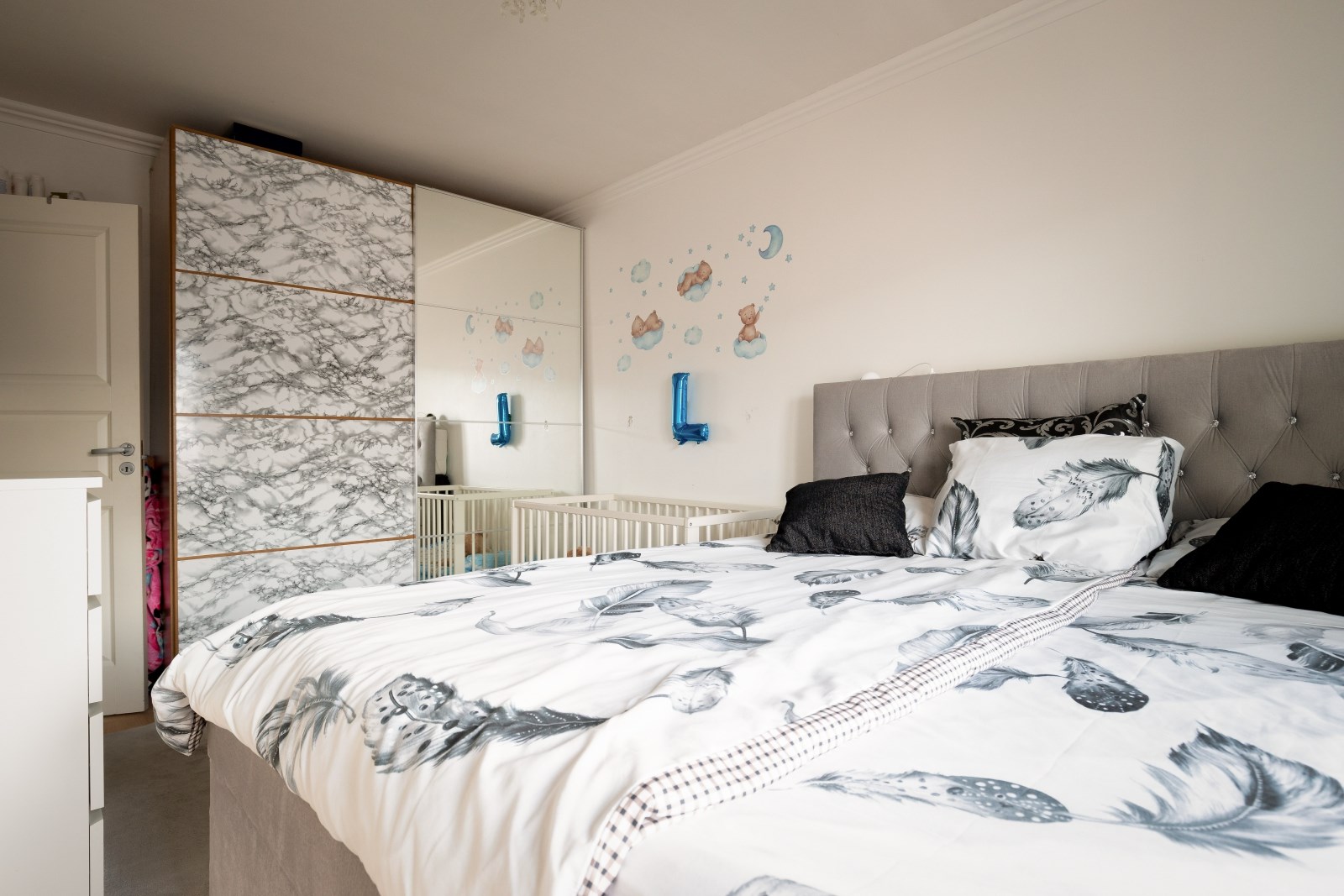 Stort sovrum med laminatgolv, garderober och fönster. Här finns plats för dubbelsäng, nattduksbord och mer därtill.