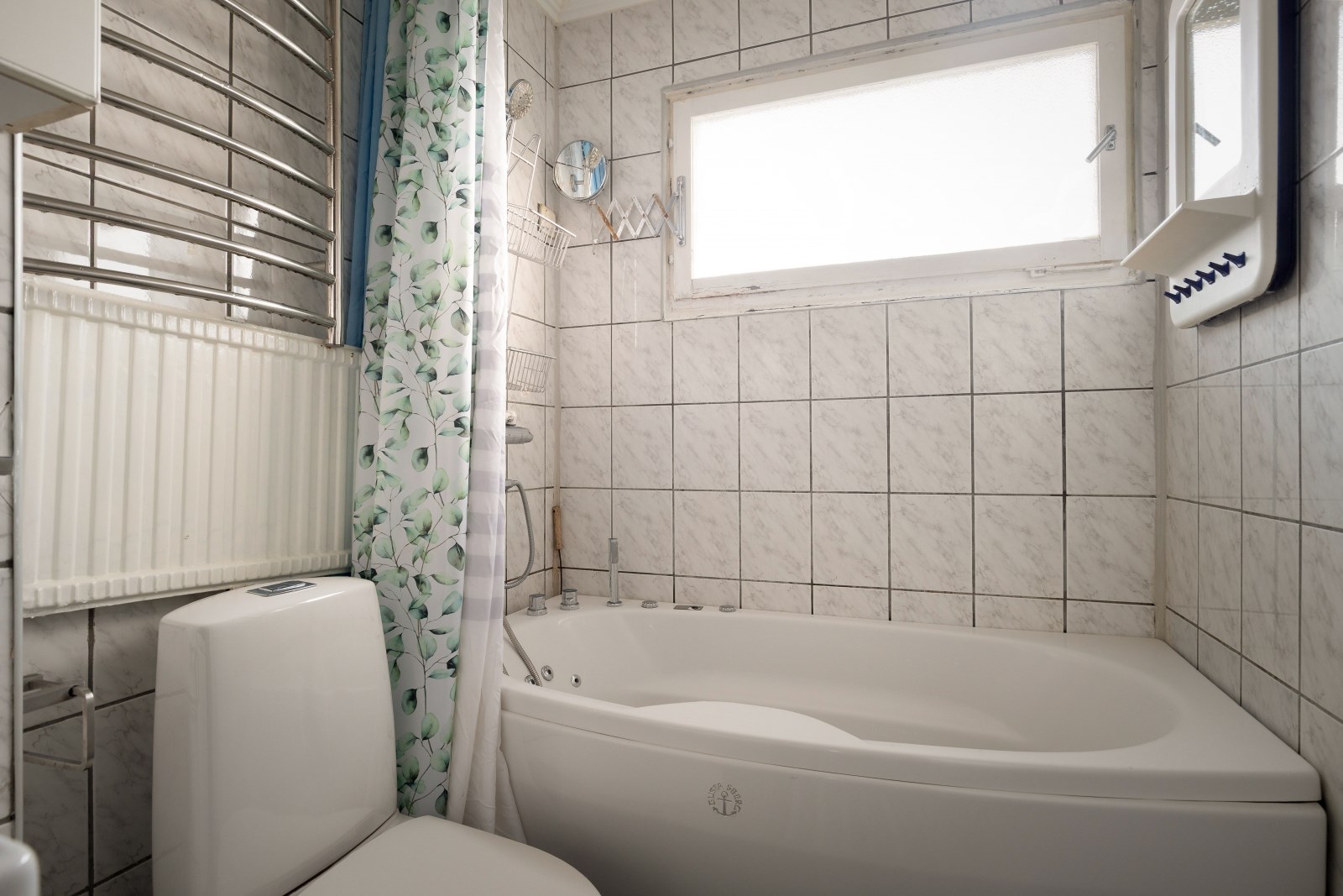 Helkaklat badrum med vädringsfönster. Badrumsutrustningen består av: wc, bubbelbadkar, skåp, kommod samt spegel med sidoskåp.