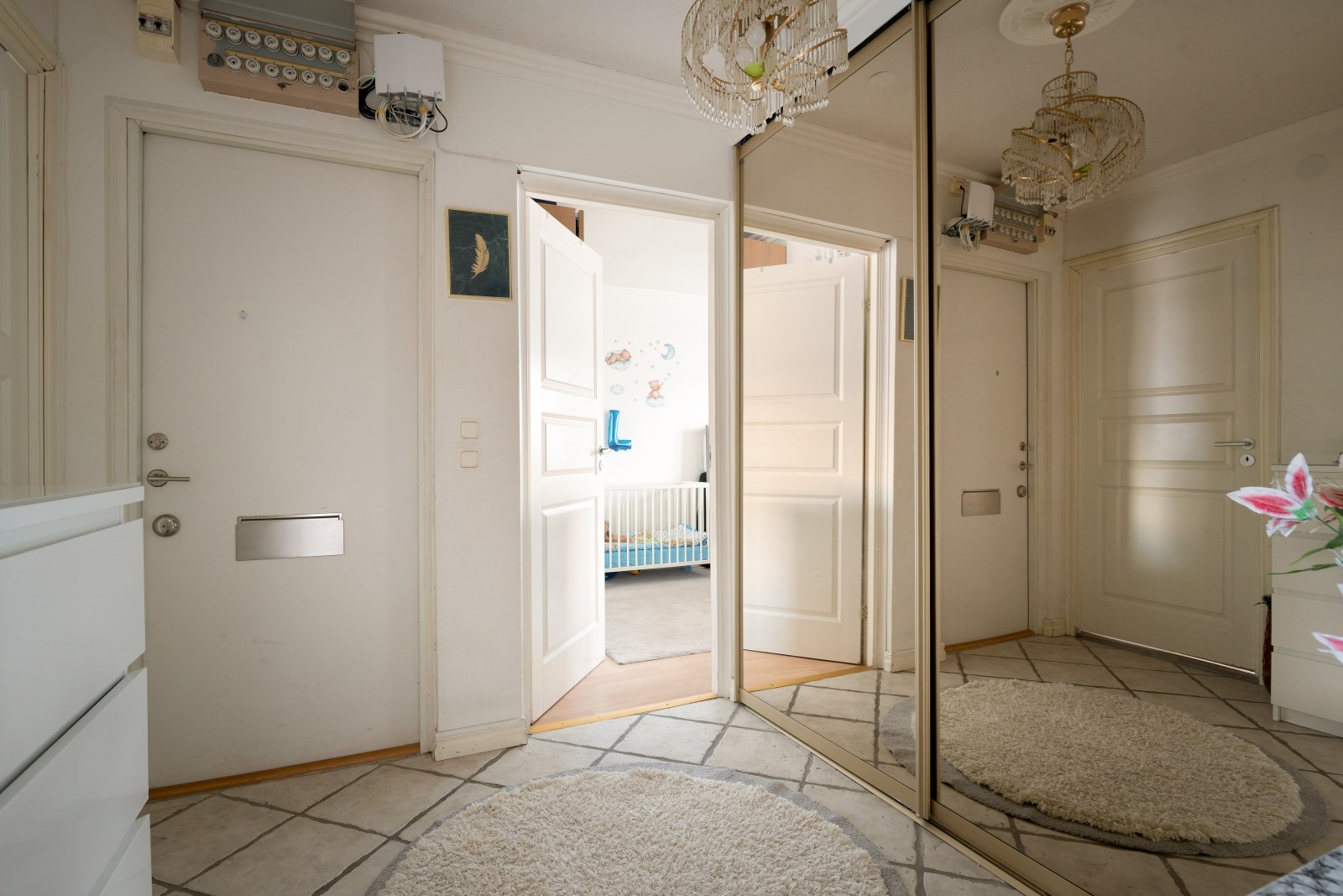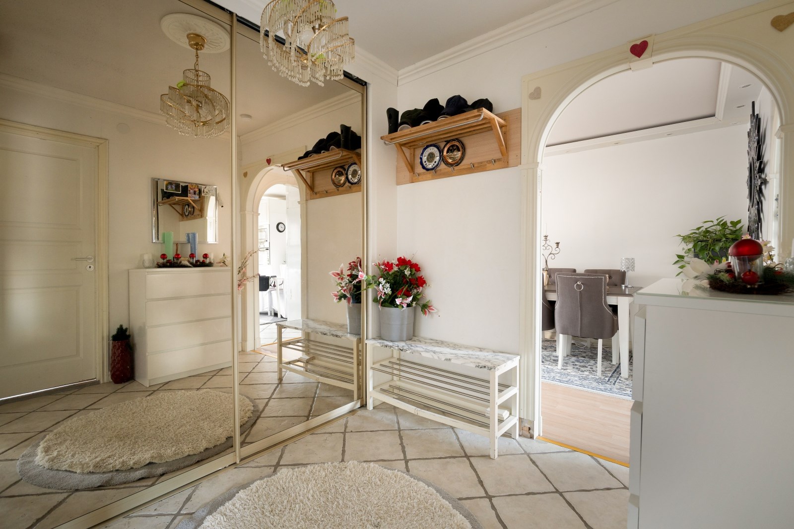 Välkomnande hall med klinkergolv, säkerhetsdörr, garderober med skjutdörrar. Här finns plats för avhängning av ytterkläder och skor.