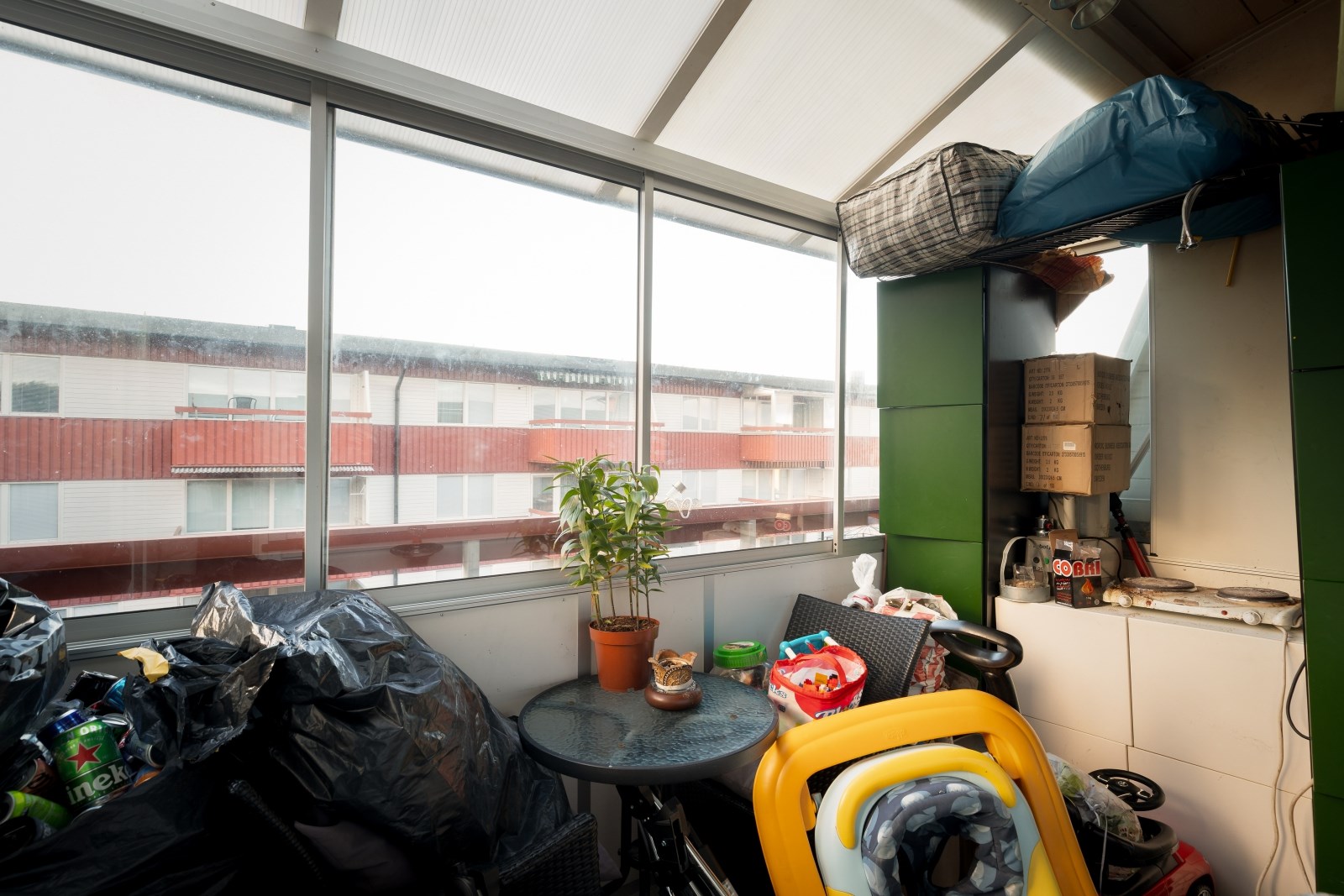 Stor inglasad balkong i västerläge. Balkongen bjuder på gott om plats att möblera med utemöbler och blommor. Det här kan bli en riktigt mysig plats för avkoppling där de praktiska skjutbara glasdörrarna kan öppnas upp eller stängas till efter säsong. Inglasningen möjliggör också en utökad användning under året