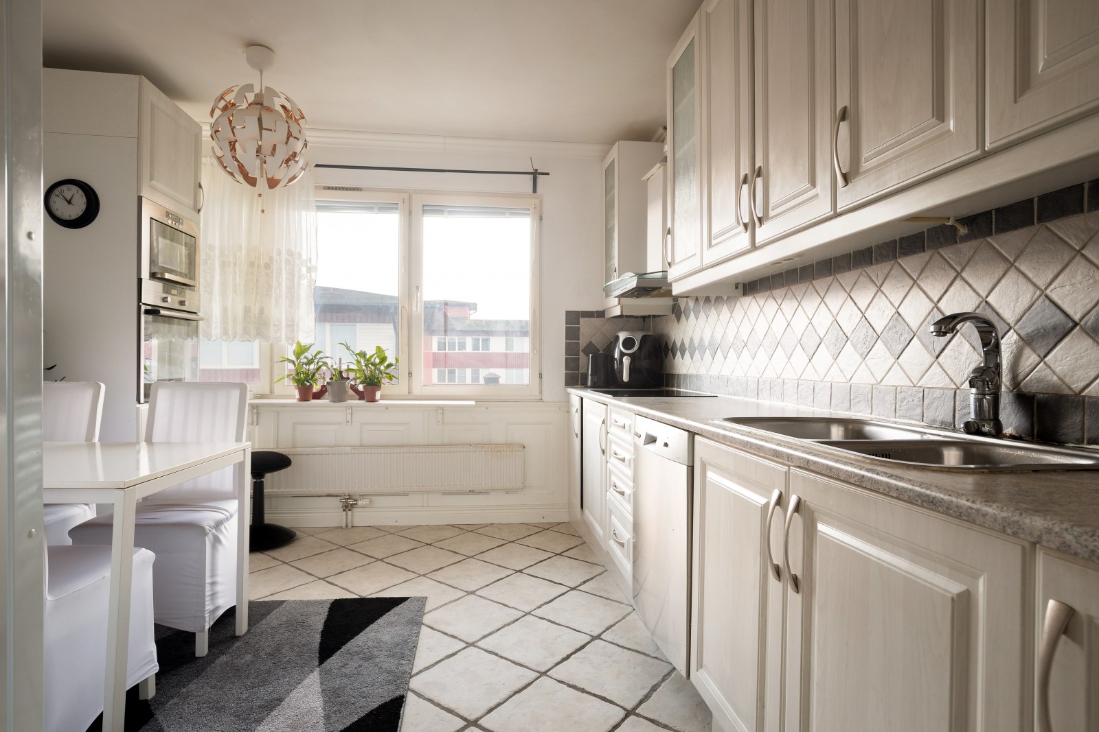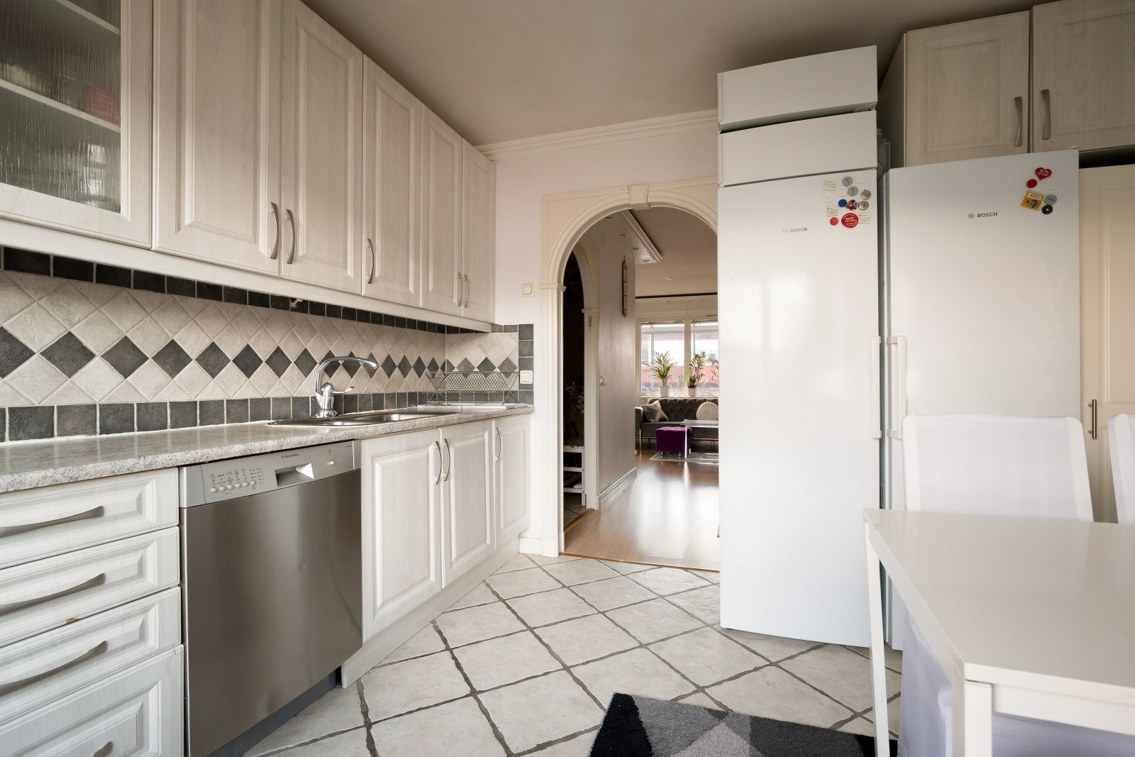 Fullutrustat kök med klinkergolv och matplats invid fönster. Här erbjuds gott om förvaring och bra arbetsytor. utrustningen består av: kyl, frys, diskmaskin, fläkt, inbyggd, ugn, inbyggd mikro samt induktionshäll.