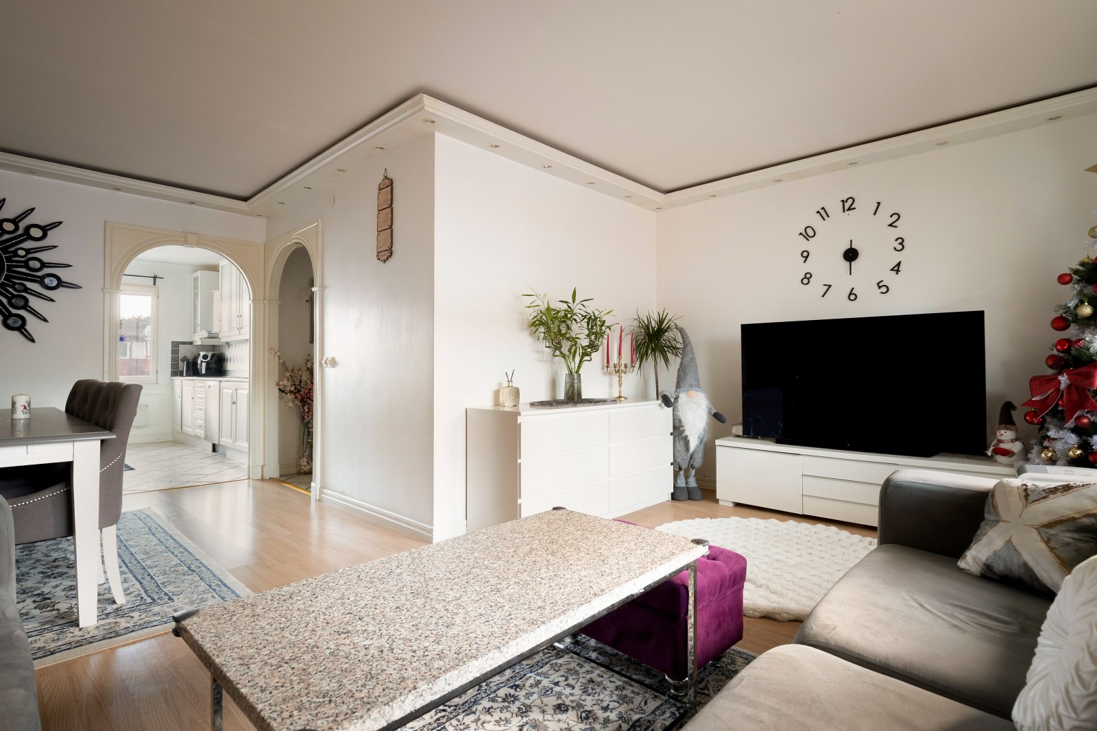 Lättmöblerat vardagsrum med laminatgolv, läcker stuckatur i tak med inbyggd spotbelysning och generösa fönsterpartier som släpper in härligt ljus. Här finns gott om plats för möblemang. Från vardagsrummet är det utgång till lägenhetens inglasade balkong.